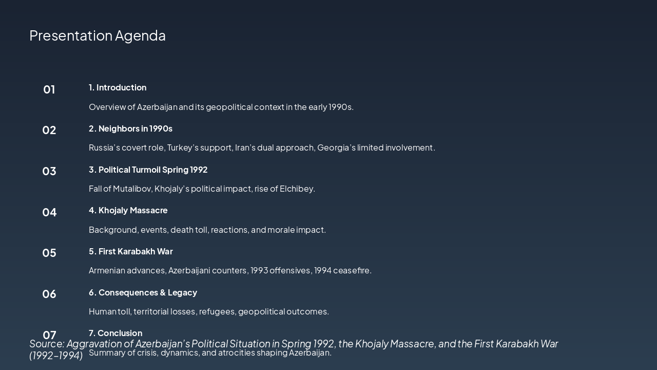 This agenda slide outlines a presentation on Azerbaijan's early 1990s geopolitical context, covering its neighbors' roles, 1992 political turmoil, the Khojaly Massacre, and the First Karabakh War up to the 1994 ceasefire. It concludes with the conflict's human toll, territorial losses, and lasting legacy.