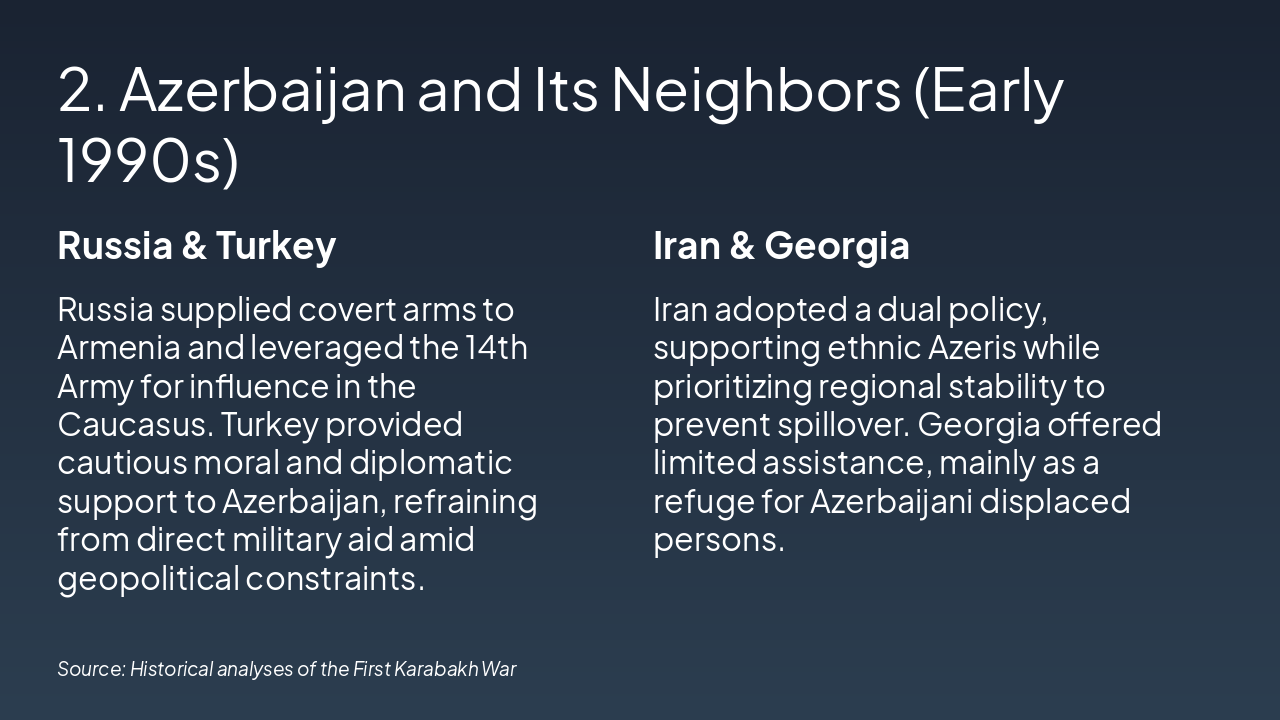 Russia’s covert role, Turkey’s support, Iran’s dual approach, Georgia’s limited involvement.