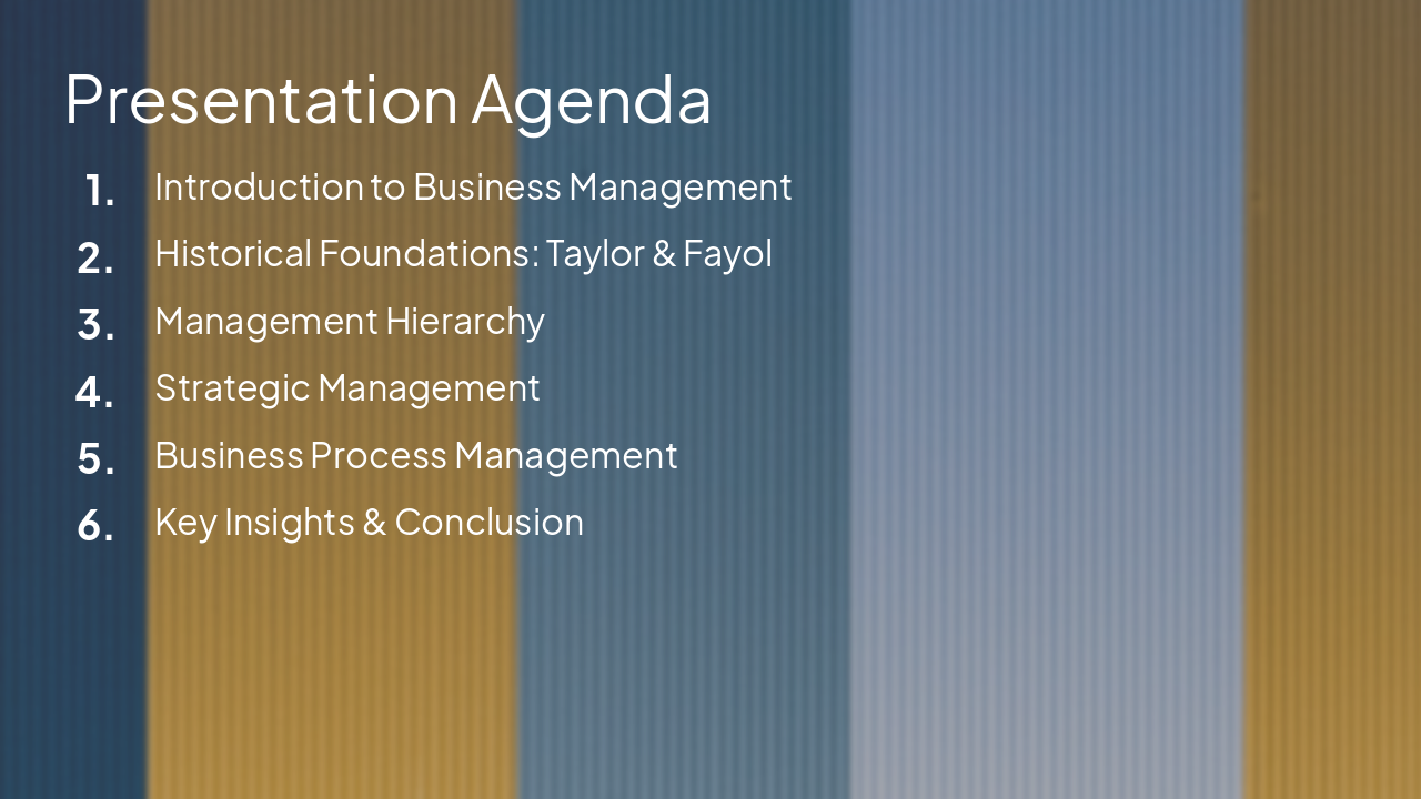 This presentation introduces business management fundamentals, historical pioneers like Taylor and Fayol, management hierarchy, strategic principles by Porter, business process management, and key insights for organizational success.