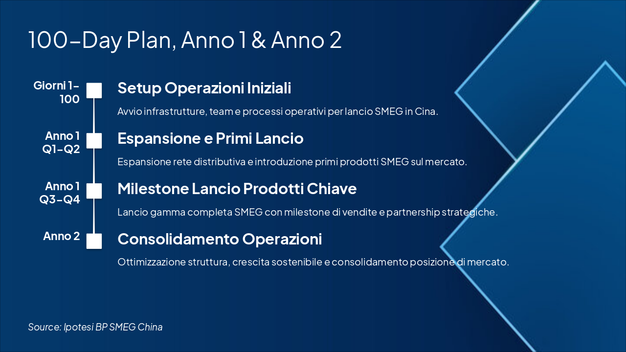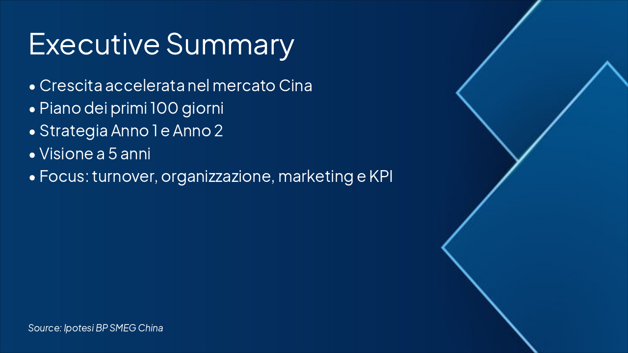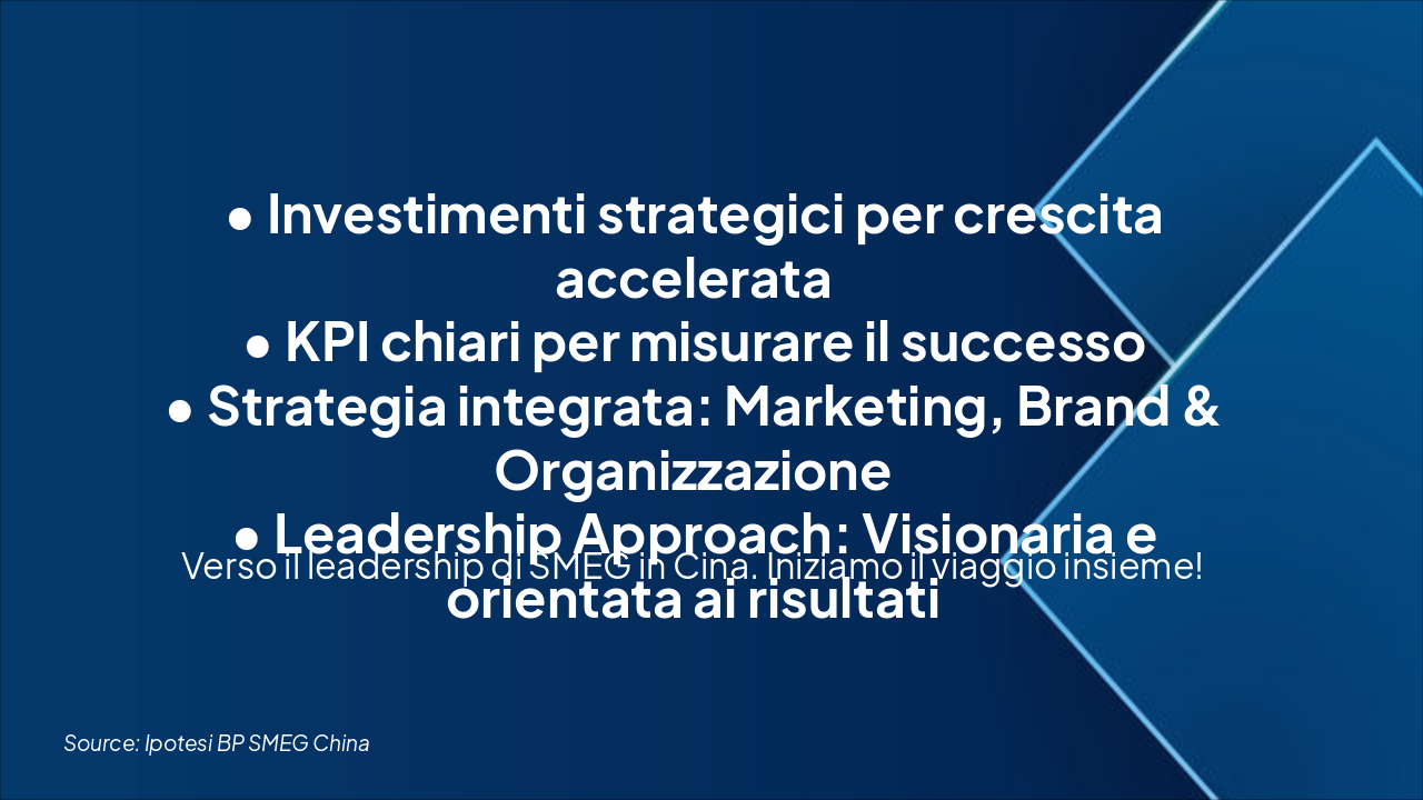 Riassunto investimenti principali, KPI di successo, strategia marketing/brand/organizzazione. Approccio leadership dedicato per il successo di SMEG in Cina.