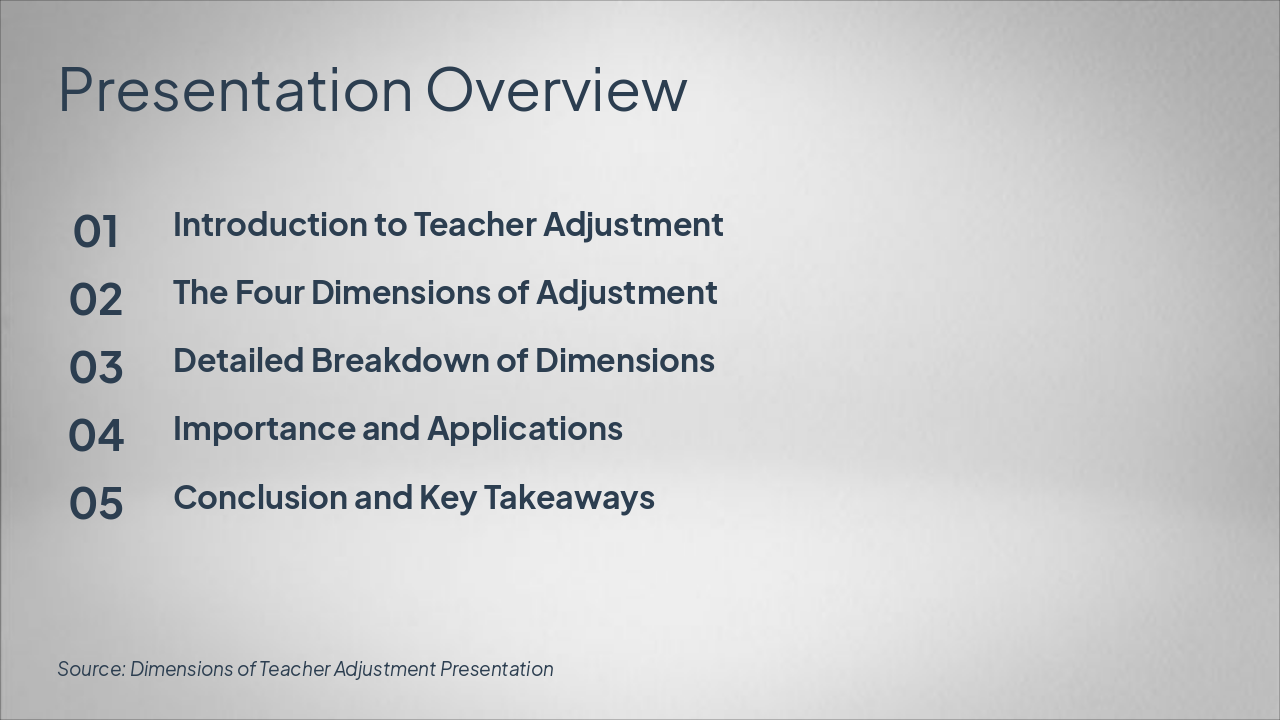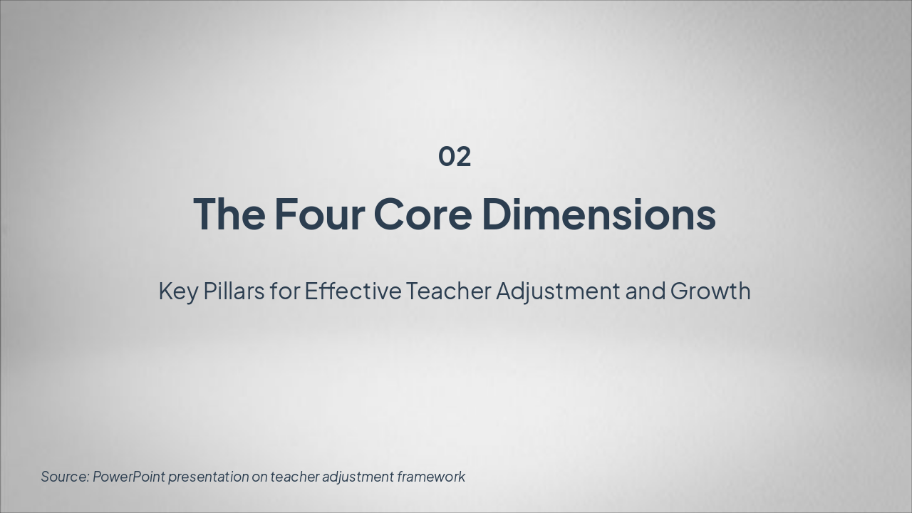 The slide titled "Dimensions of Teacher Adjustment" serves as a title slide. Its subtitle, "Understanding Key Aspects of Teacher Adaptation in Education," highlights the focus on core elements of how teachers adapt in educational settings.
