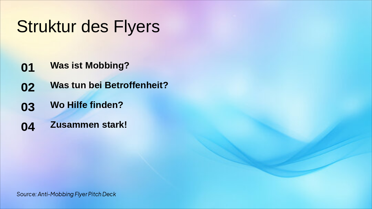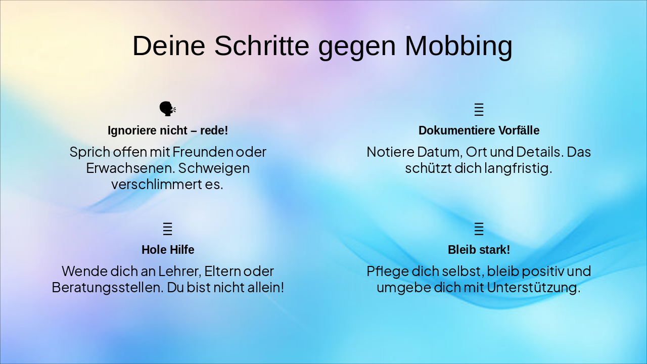 { "features": [ { "icon": "🗣️", "heading": "Ignoriere nicht – rede!", "description": "Sprich offen mit Freunden oder Erwachsenen. Schweigen verschlimmert es." }, { "icon": "📝", "heading": "Dokumentiere Vorfälle", "description": "Notiere Datum, Ort und Details. Das schützt dich langfristig." }, { "icon": "🆘", "heading": "Hole Hilfe", "description": "Wende dich an Lehrer, Eltern oder Beratungsstellen. Du bist nicht allein!" }, { "icon": "💪", "heading": "Bleib stark!", "description": "Pflege dich selbst, bleib positiv und umgebe dich mit Unterstützung." } ] }