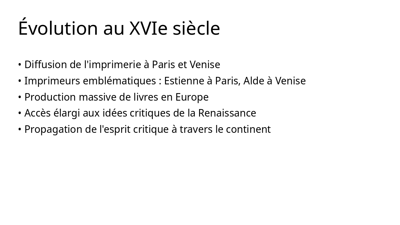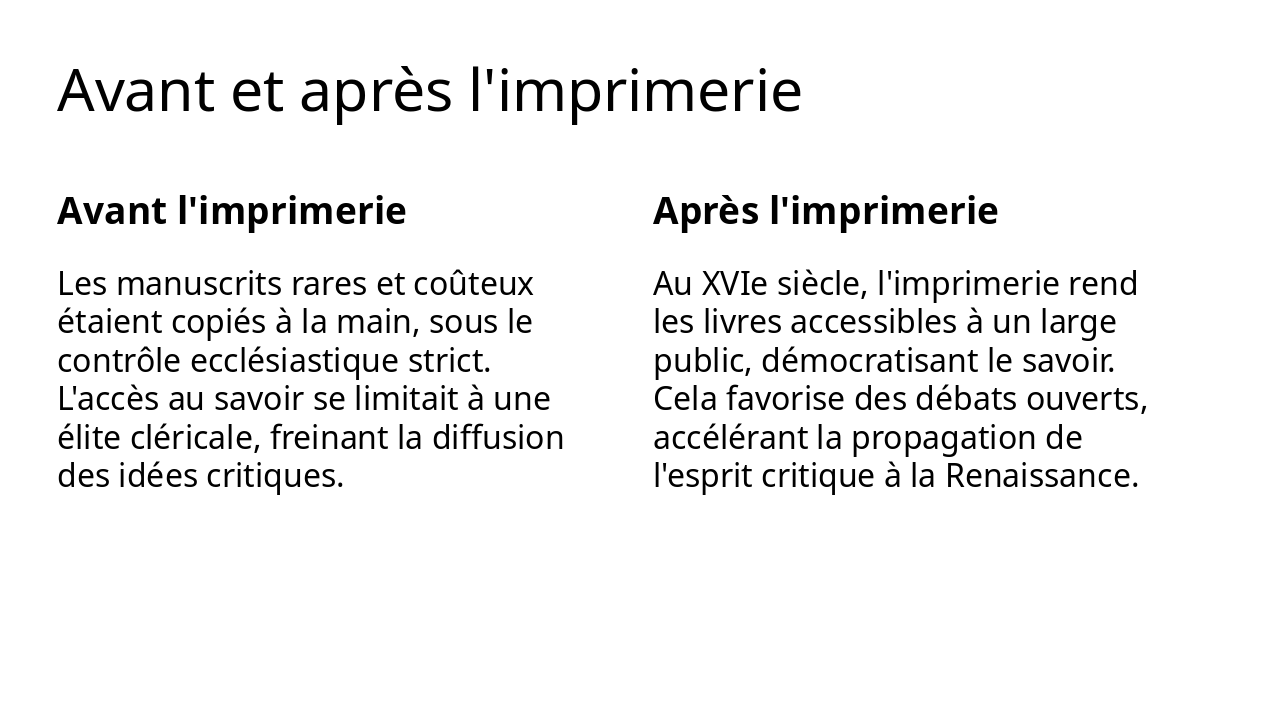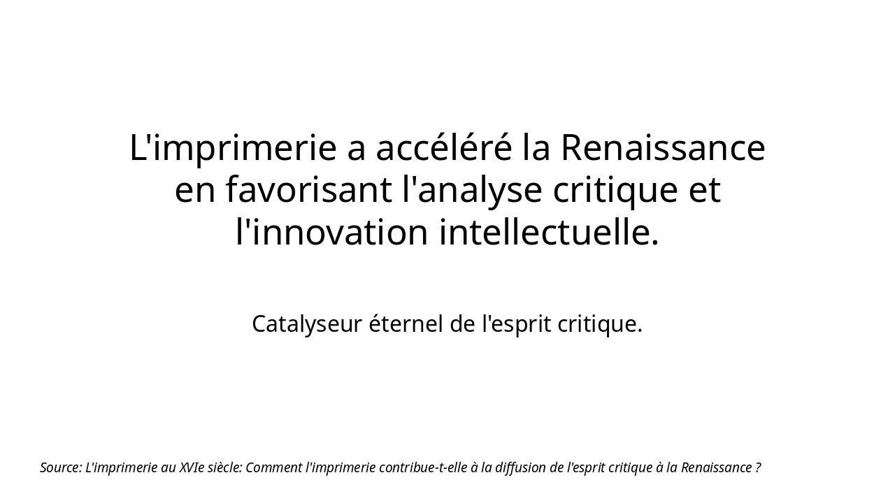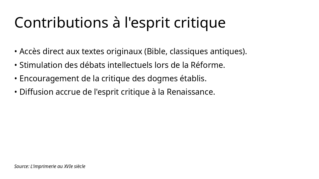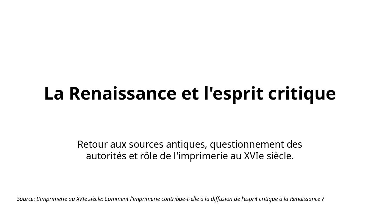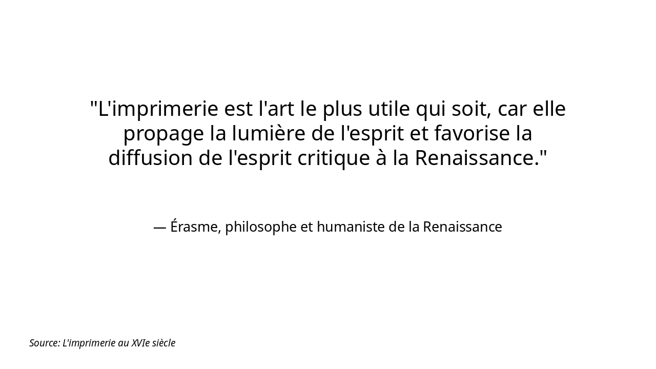 Description: 'L'imprimerie est l'art le plus utile qui soit, car elle propage la lumière de l'esprit.' (Adapté d'Érasme). Context: L'imprimerie au XVIe siècle: Comment l'imprimerie contribue-t-elle à la diffusion de l'esprit critique à la Renaissance ?