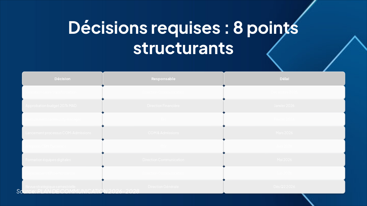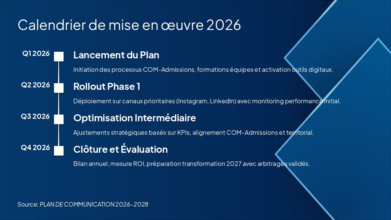 { "headers": [ "Phase", "Owner", "Duration", "Key Actions" ], "rows": [ [ "Lead Generation", "COM", "Ongoing", "Social media, events, website forms" ], [ "Lead Qualification", "COM & Admissions", "1-2 days", "Lead scoring, initial contact, eligibility check" ], [ "Nurturing & Conversion", "COM", "1-4 weeks", "Personalized emails, webinars, retargeting ads" ], [ "Inscription", "Admissions", "1 day", "Application submission, validation, enrollment confirmation" ] ] }