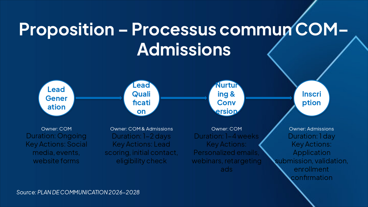 This slide depicts the common COM-Admissions workflow, outlining four phases: Lead Generation (COM, ongoing, via social media/events), Lead Qualification (COM & Admissions, 1-2 days, with scoring/contact), Nurturing & Conversion (COM, 1-4 weeks, via emails/webinars), and Inscription (Admissions, 1 day, for application/validation). It uses a table format with columns for Phase, Owner, Duration, and Key Actions.
