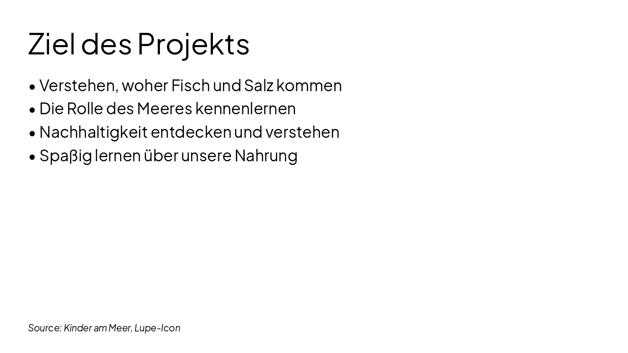 Der Titel der Folie lautet „Woher kommt mein Fisch und mein Salz?“ und stellt eine Frage zur Herkunft dieser Produkte. Als Untertitel heißt es „Eine Reise ins Meer 🌊“, was auf eine Erkundung im Ozean hinweist.