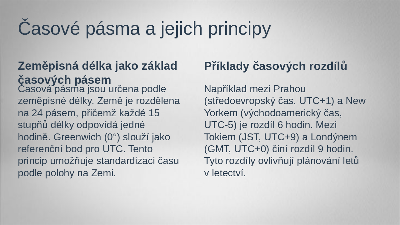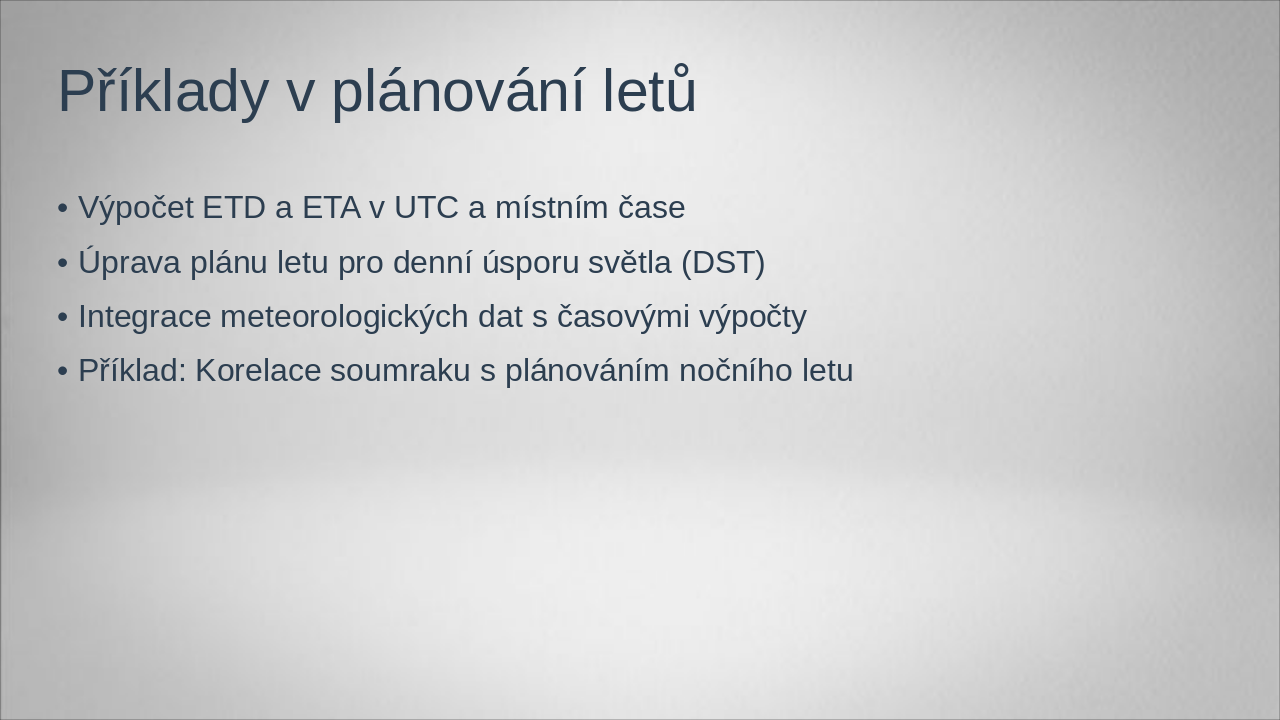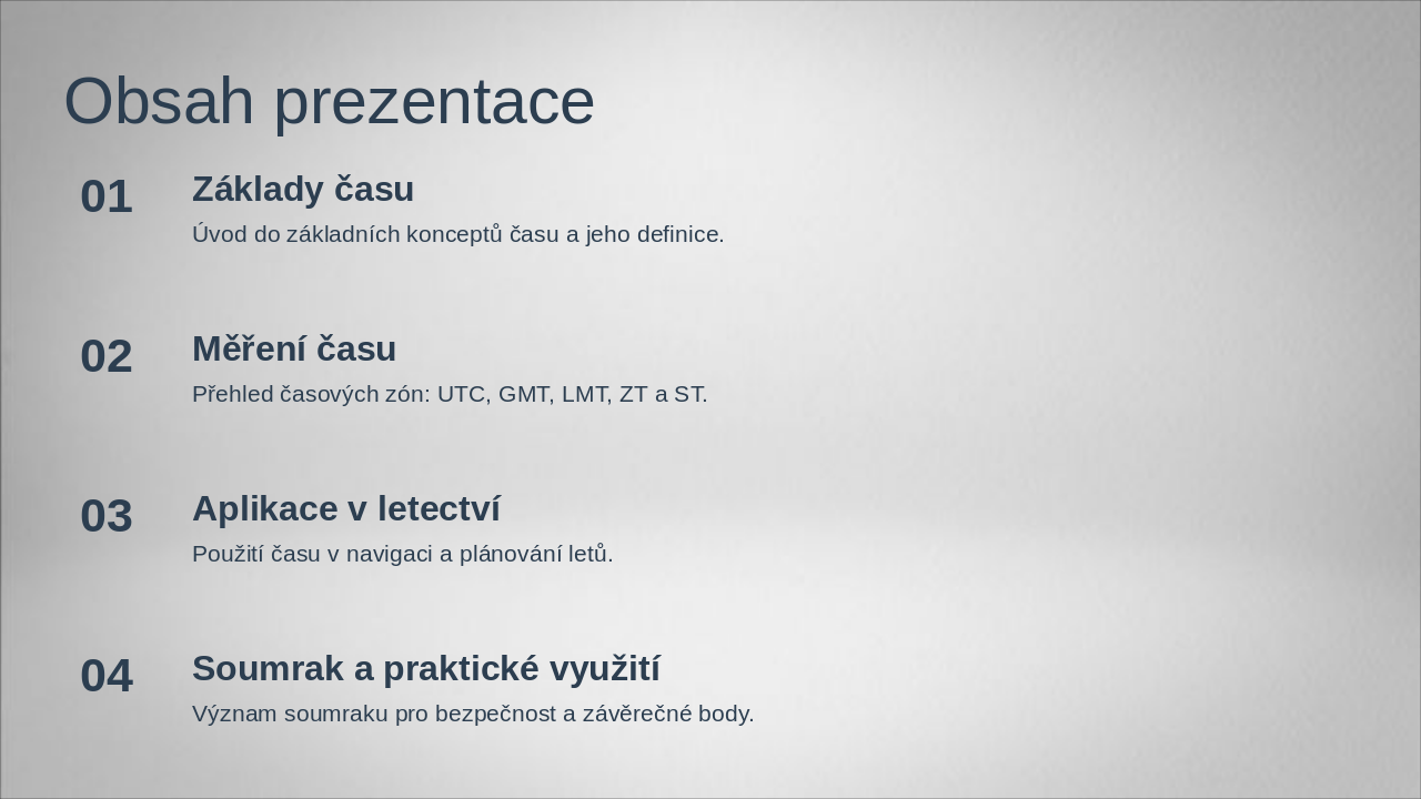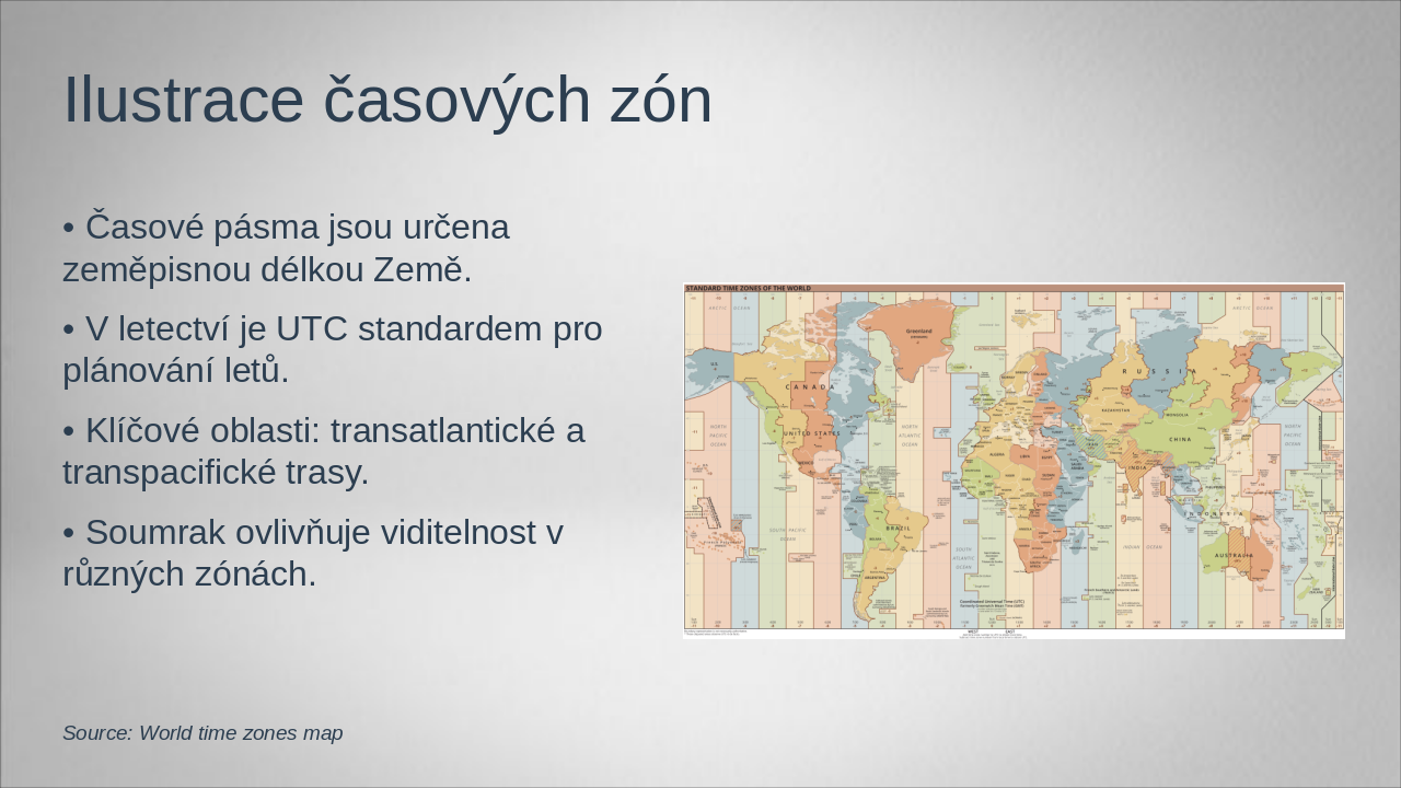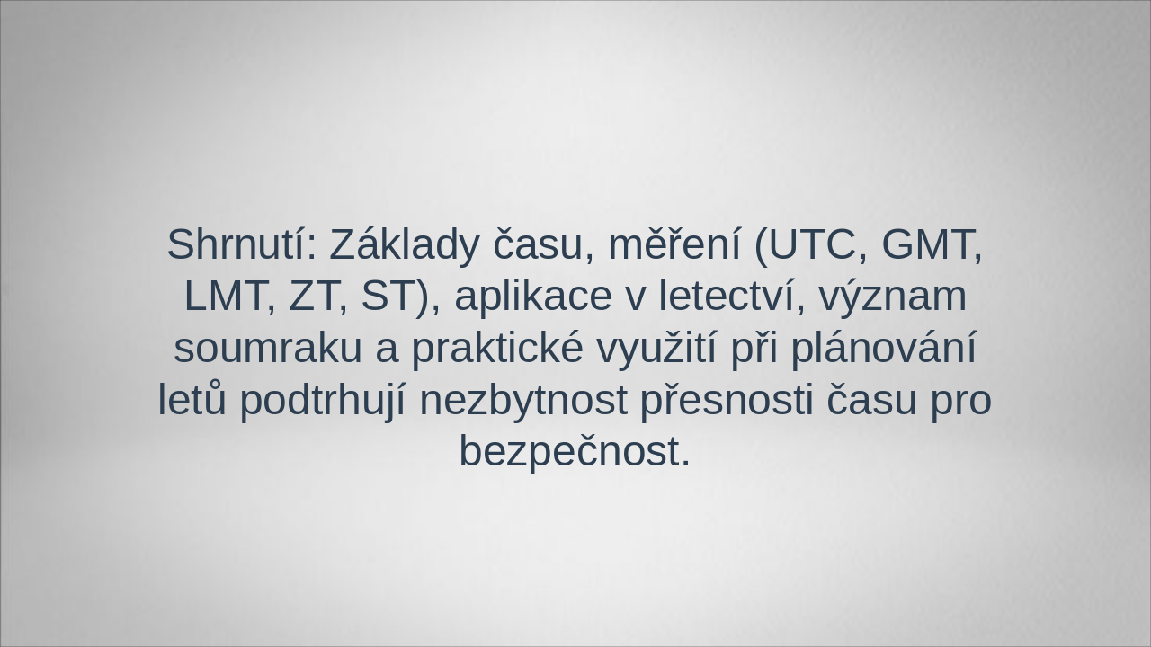 Shrnutí: Základy času, měření (UTC, GMT, LMT, ZT, ST), aplikace v letectví, význam soumraku a praktické využití při plánování letů podtrhují nezbytnost přesnosti času pro bezpečnost.