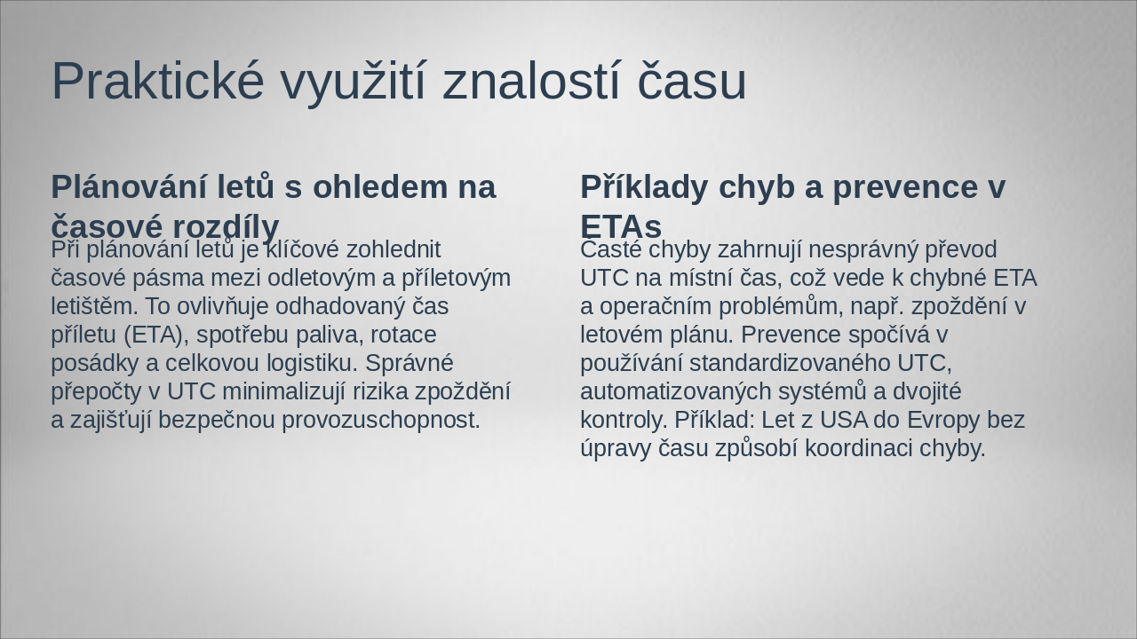 Closing message: Přesný čas zajišťuje bezpečnost letů. Call-to-action: Aplikujte tyto znalosti pro efektivní plánování letů a bezpečnost.
