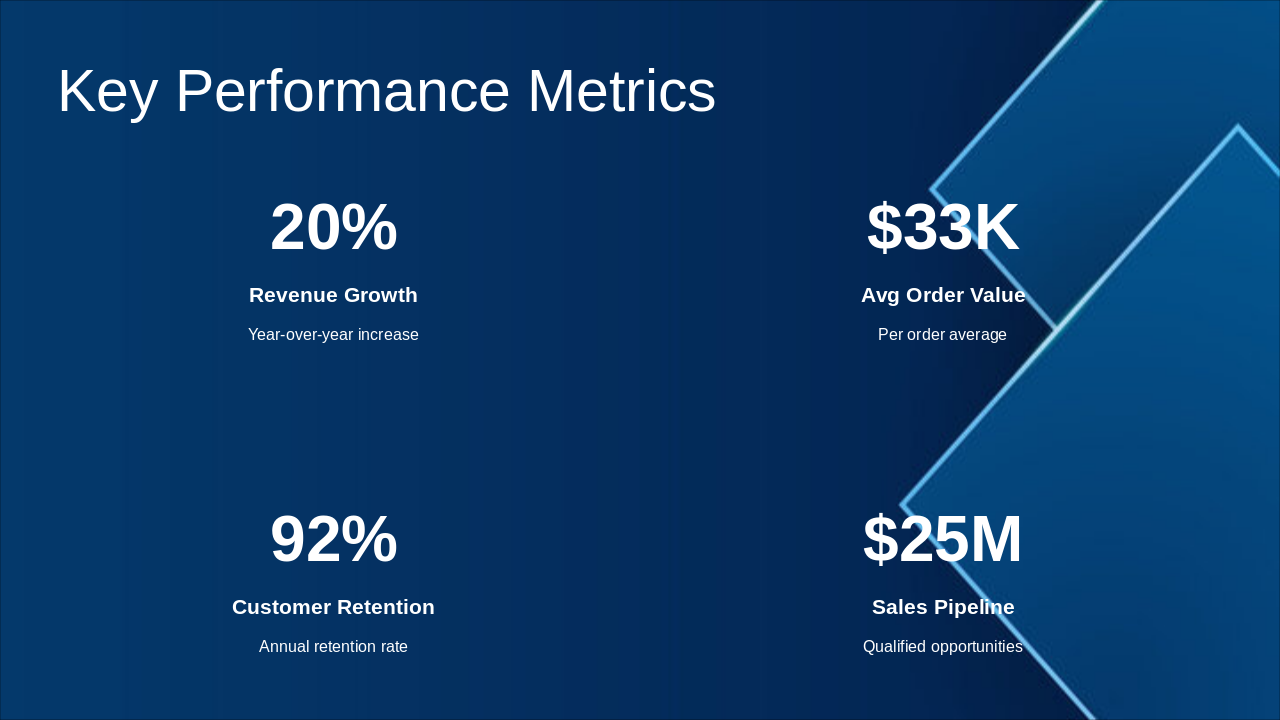 The Key Performance Metrics slide showcases 20% year-over-year revenue growth and a $33K average order value. It also highlights 92% annual customer retention and a $25M sales pipeline of qualified opportunities.