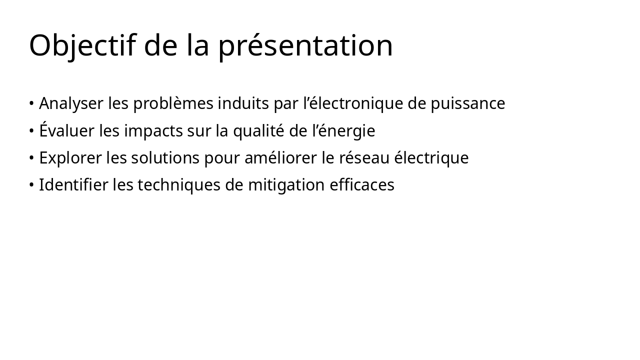 The slide is titled "Problèmes de qualité de l’énergie," which translates to "Power Quality Issues." It features a subtitle highlighting the challenges posed by power electronics in modern electrical grids, presented by [Your Name].