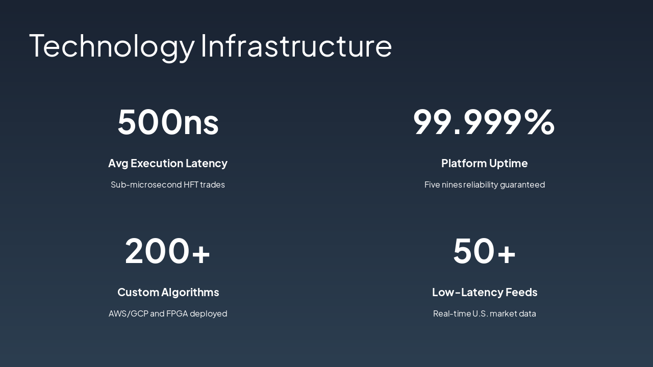 The Risk Management workflow slide outlines five key risk layers in a table: real-time monitoring, position limits, stress testing, hedging protocols, and daily reviews. Each includes a specific control mechanism and frequency, from real-time/continuous to daily or as needed.