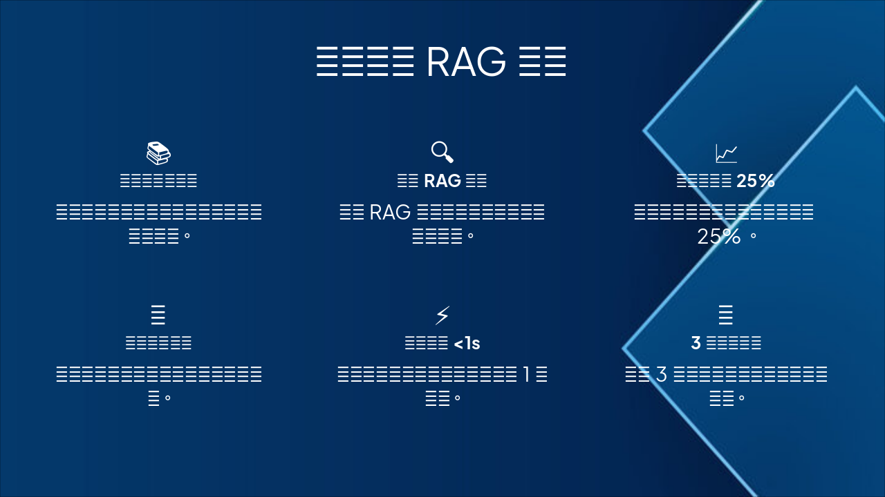 This slide highlights enterprise knowledge base building with efficient storage, RAG integration for precise retrieval, multi-source data fusion, 25% accuracy gains, and sub-1-second response times. It also notes successful validation in 3 real business cases.
