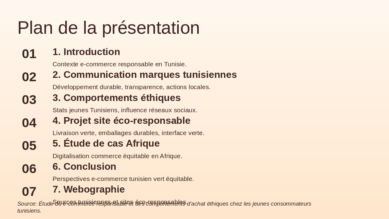 This agenda slide outlines the structure of a presentation on responsible e-commerce in Tunisia. It covers an introduction to the context, Tunisian brand communications on sustainability, ethical behaviors among youth, an eco-responsible website project, an African case study, conclusions, and bibliography.