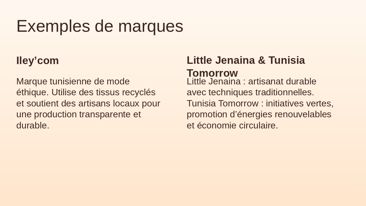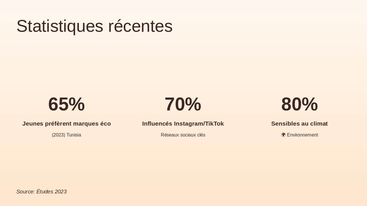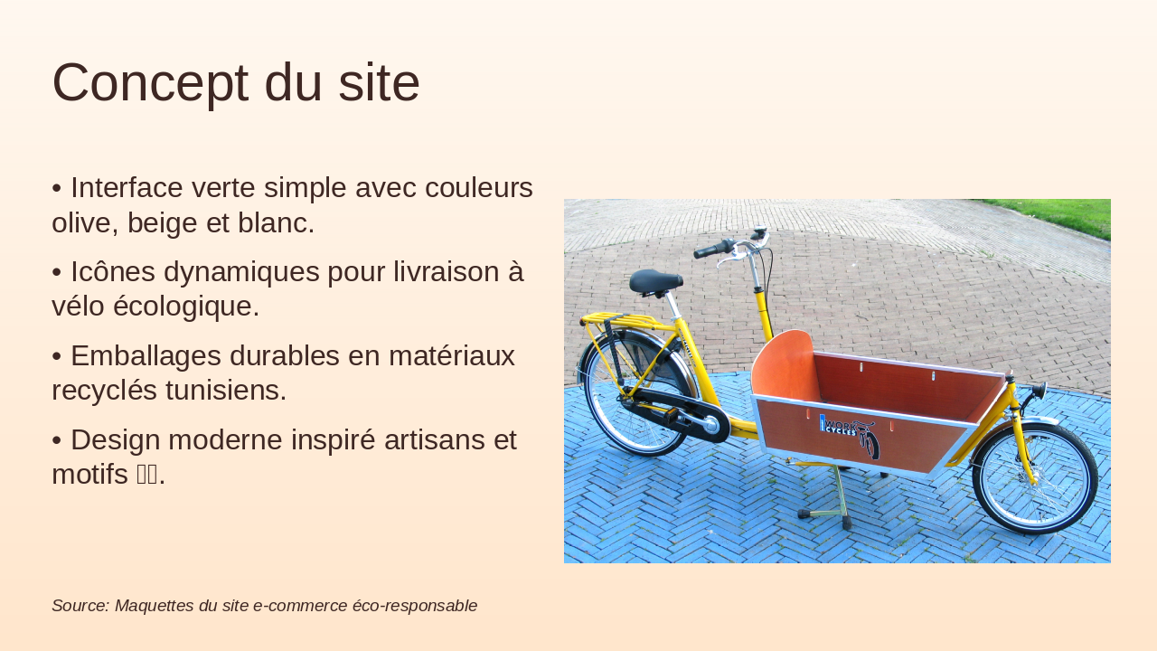 Présenter dynamiquement avec visuels tunisiens, pictos écologiques, couleurs vert olive, beige, blanc. Peu de texte, focus structure.