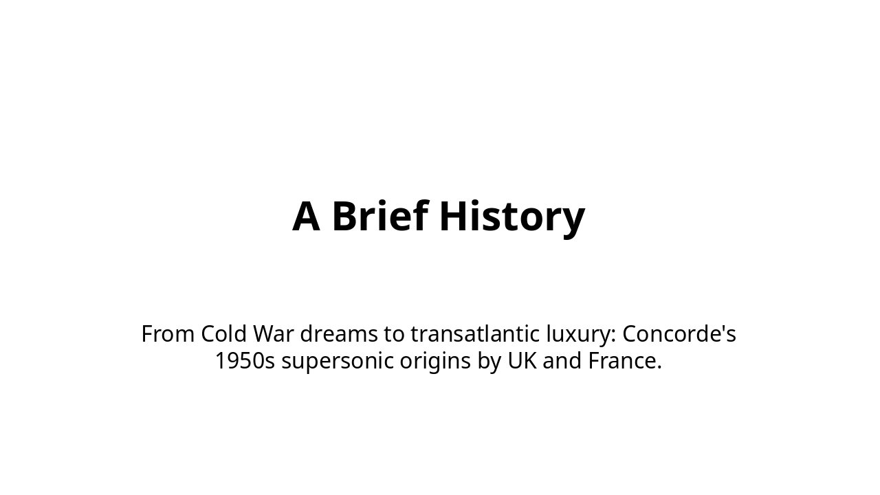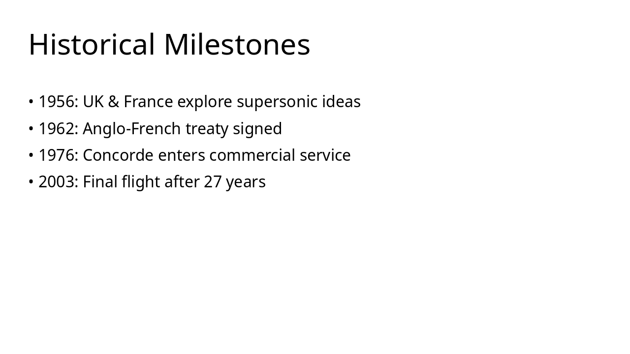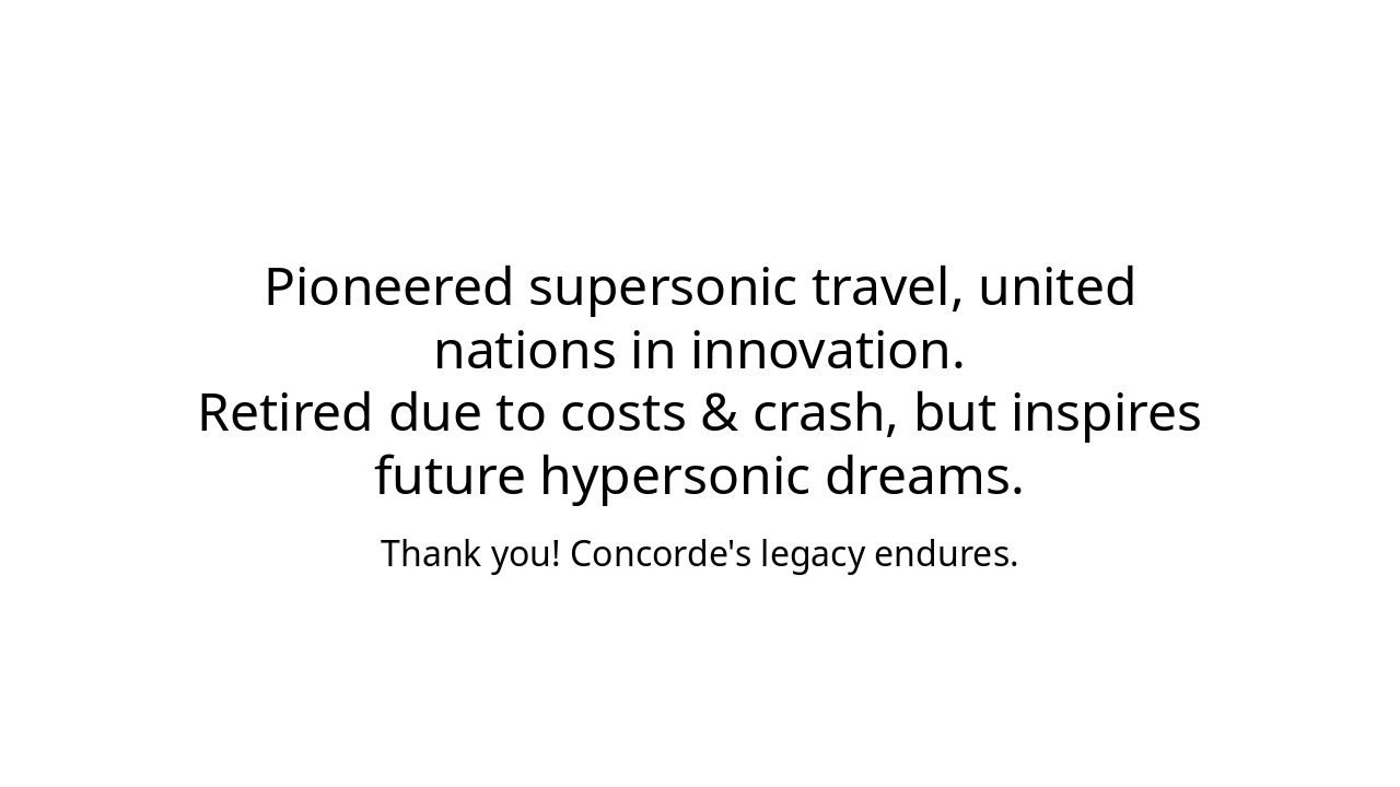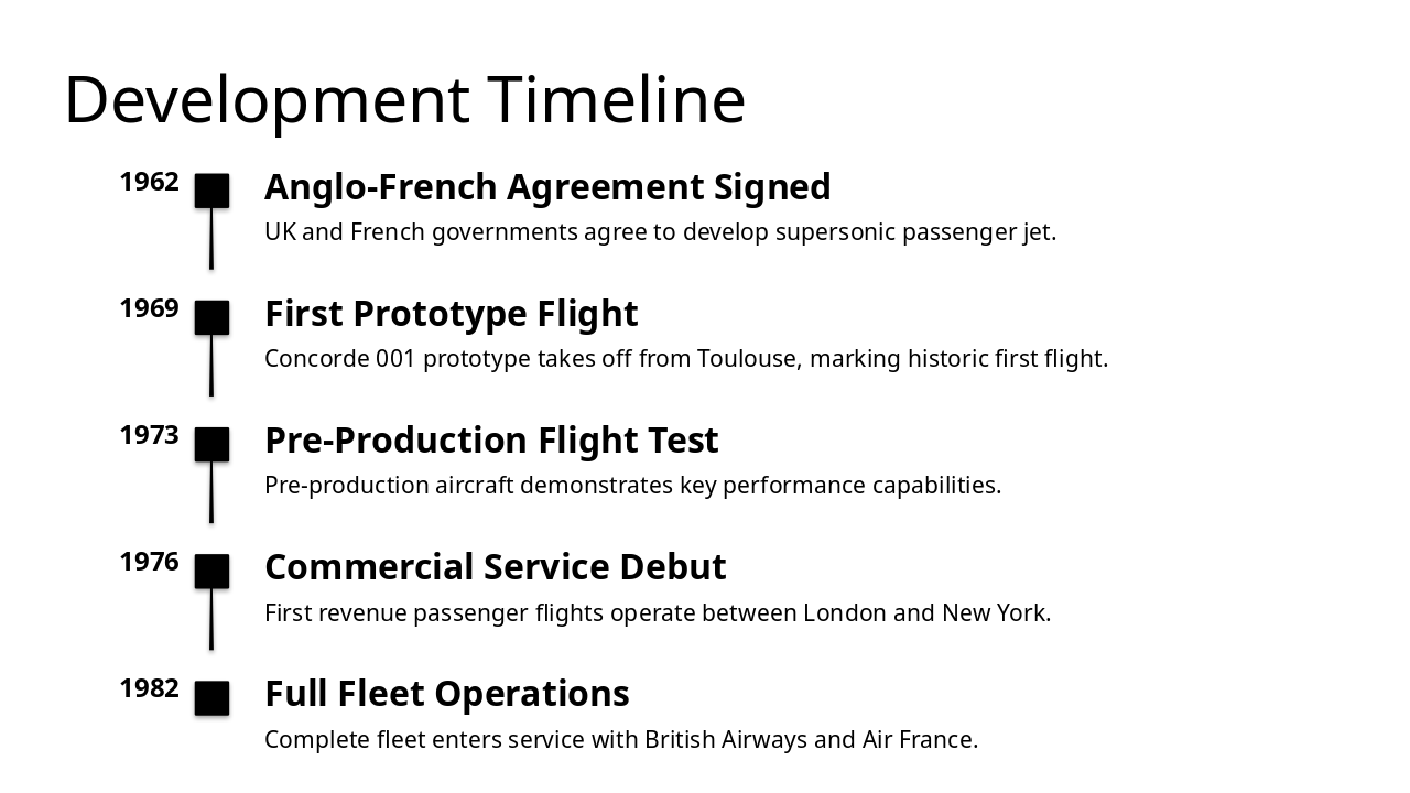 This agenda slide outlines a presentation on the Concorde supersonic jet, starting with its history and early concepts. It then covers the development timeline, creators' roles, key features like delta wings and Mach 2 speed, and technical stats with its legacy.