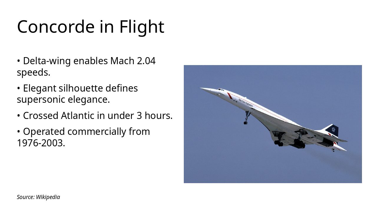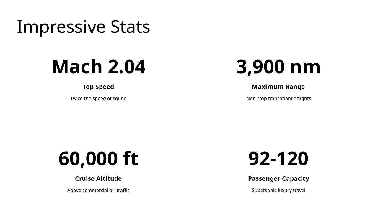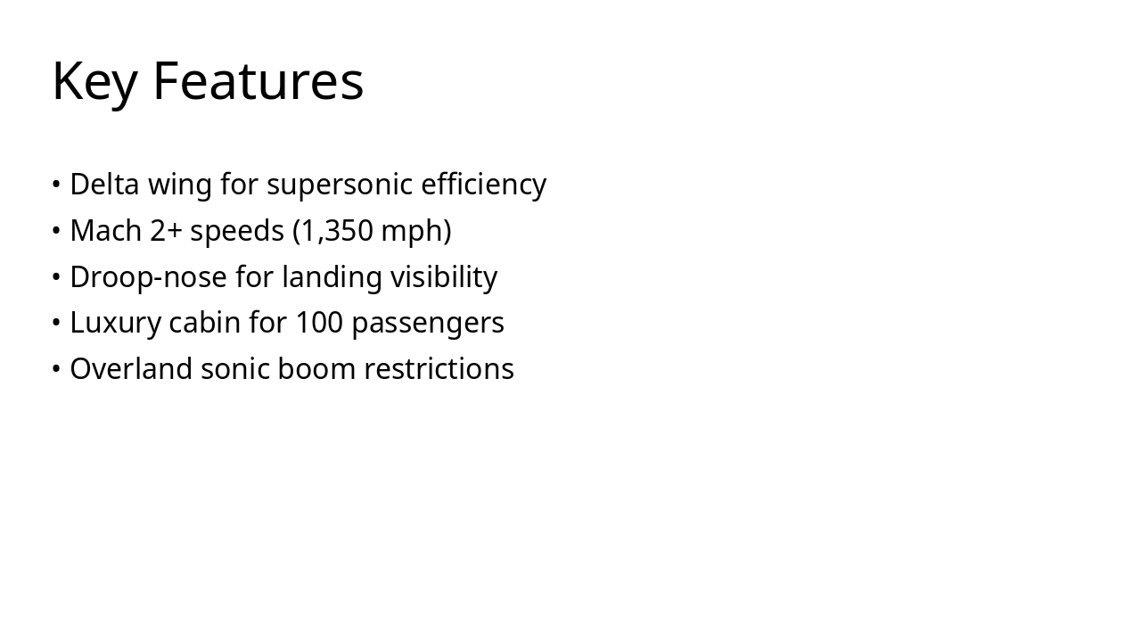 Delta wings, Mach 2 speed, and luxury passenger accommodations.