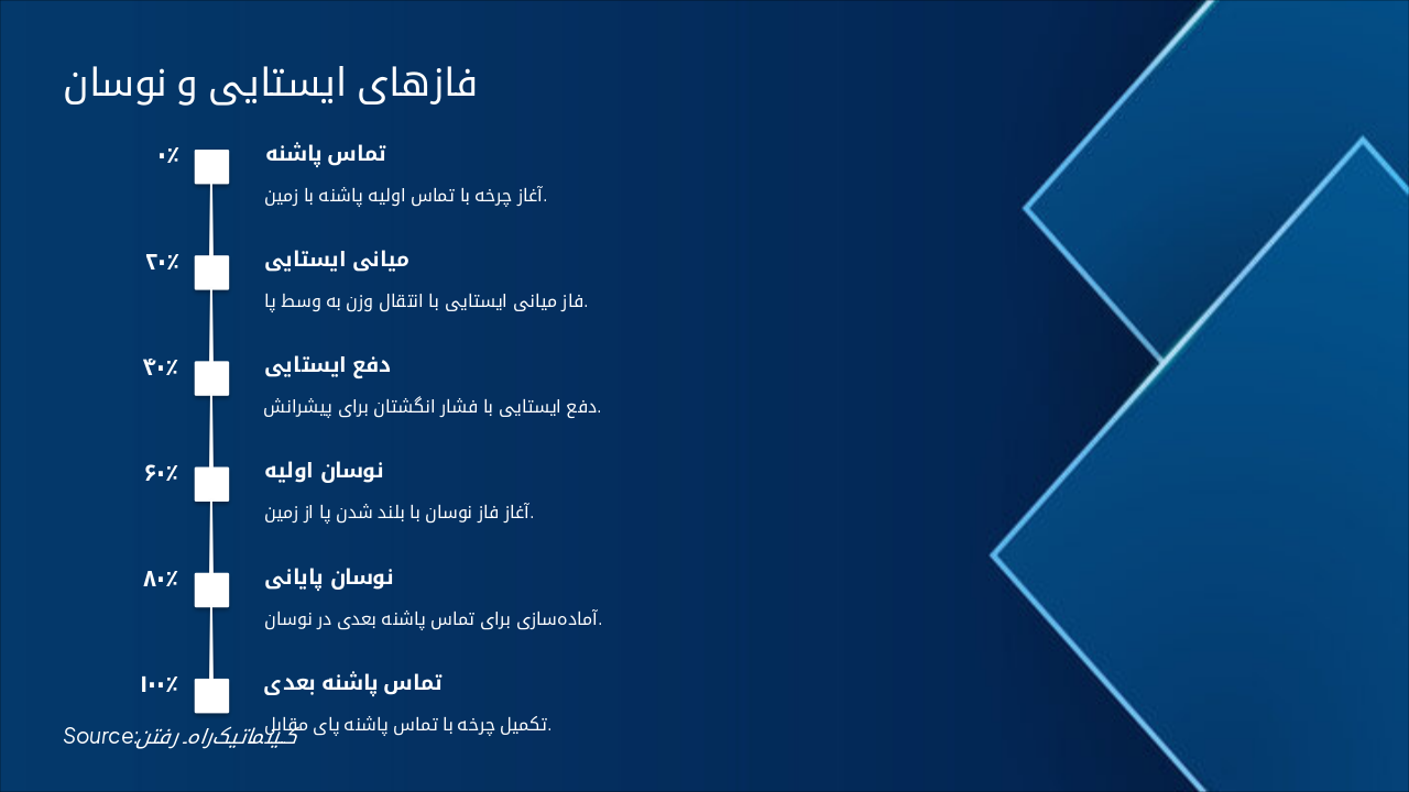 ۰٪: تماس پاشنه آغاز چرخه با تماس اولیه پاشنه با زمین. ۲۰٪: میانی ایستایی فاز میانی ایستایی با انتقال وزن به وسط پا. ۴۰٪: دفع ایستایی دفع ایستایی با فشار انگشتان برای پیشرانش. ۶۰٪: نوسان اولیه آغاز فاز نوسان با بلند شدن پا از زمین. ۸۰٪: نوسان پایانی آمادهسازی برای تماس پاشنه بعدی در نوسان. ۱۰۰٪: تماس پاشنه بعدی تکمیل چرخه با تماس پاشنه پای مقابل.