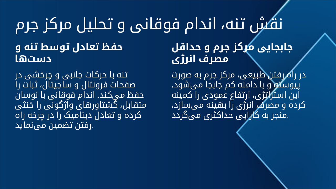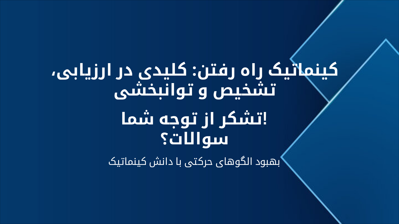 این اسلاید مراحل چرخه راه رفتن را از ۰٪ تا ۱۰۰٪ نشان میدهد، شامل فازهای ایستایی (تماس پاشنه در ۰٪، میانی ایستایی در ۲۰٪، و دفع ایستایی در ۴۰٪) و فازهای نوسان (نوسان اولیه در ۶۰٪، نوسان پایانی در ۸۰٪، و تماس پاشنه بعدی در ۱۰۰٪). هر مرحله با توصیف مختصری از حرکت پا همراه است.