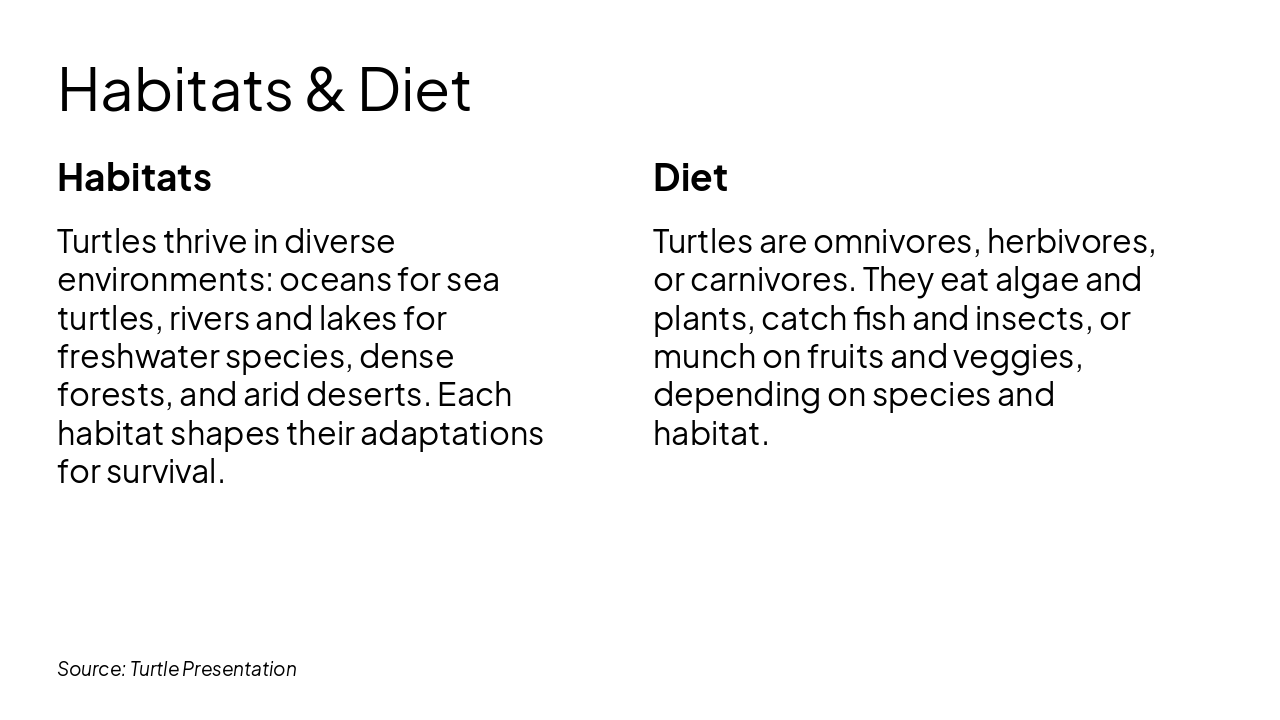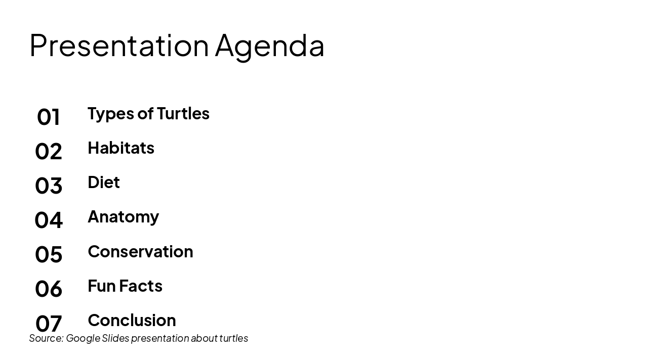 This title slide introduces "The Fascinating World of Turtles" as its main theme. The subtitle highlights key topics to explore, including types, habitats, diet, anatomy, conservation, and fun facts.