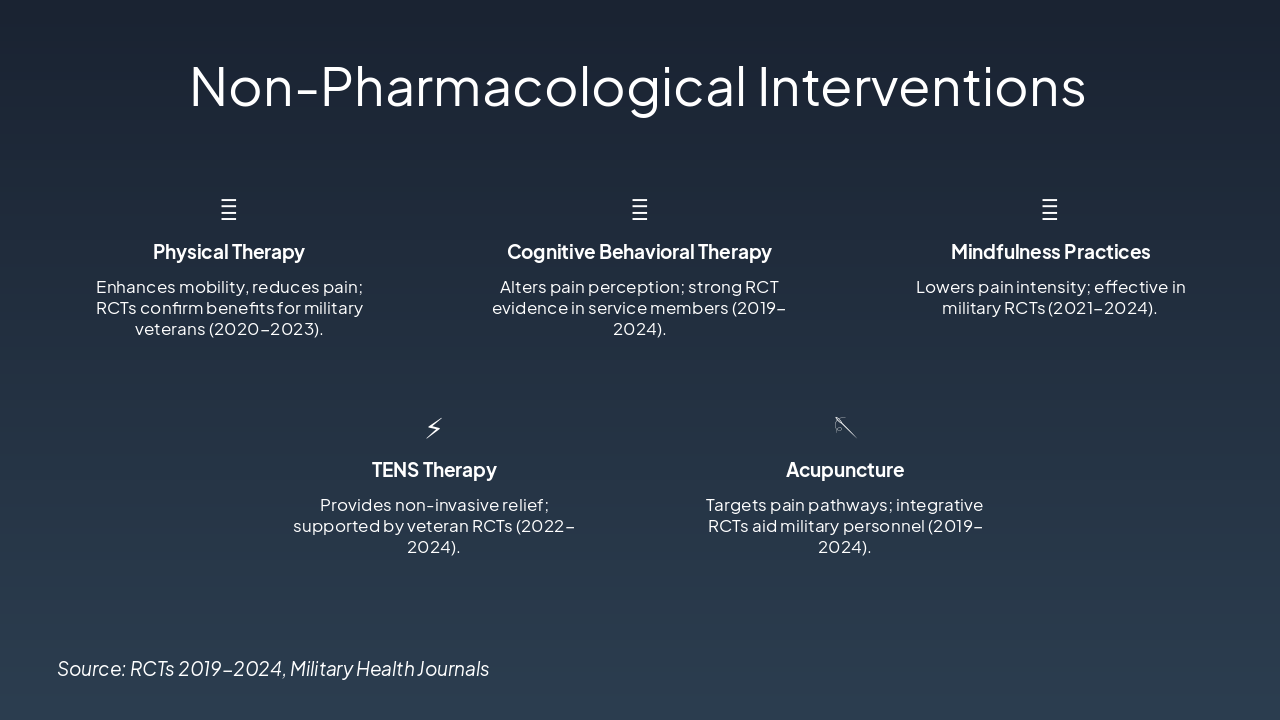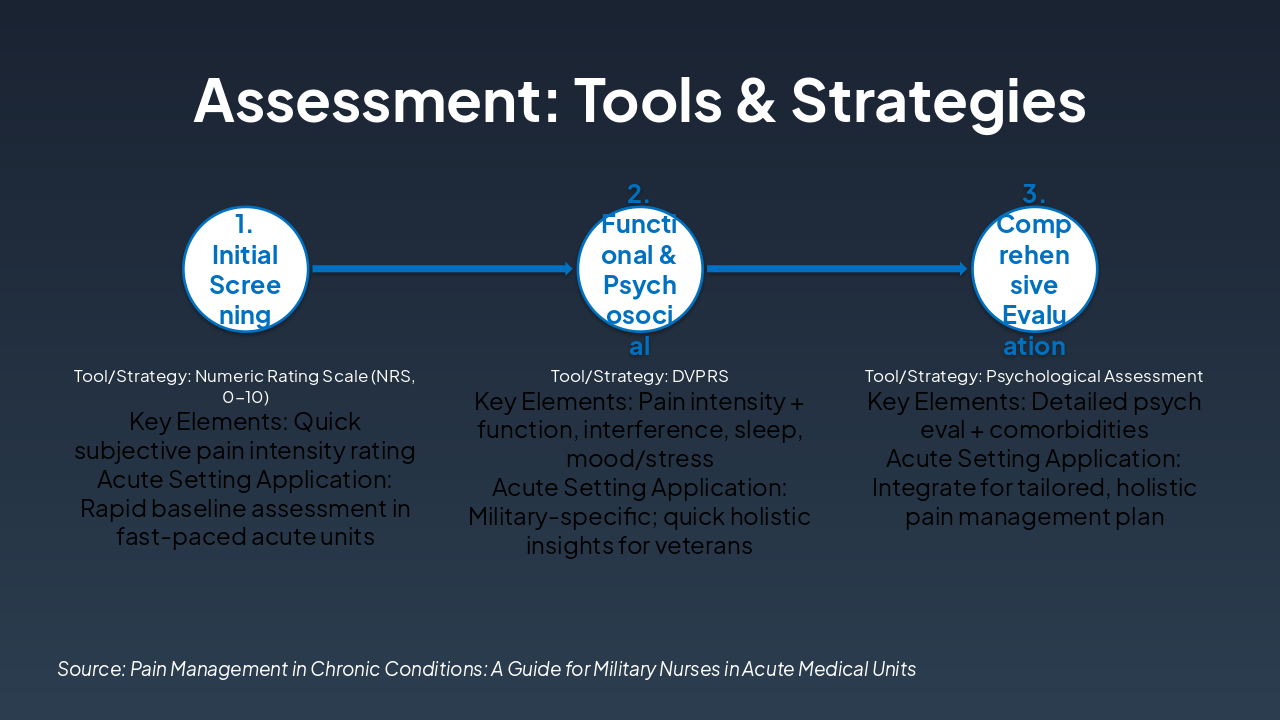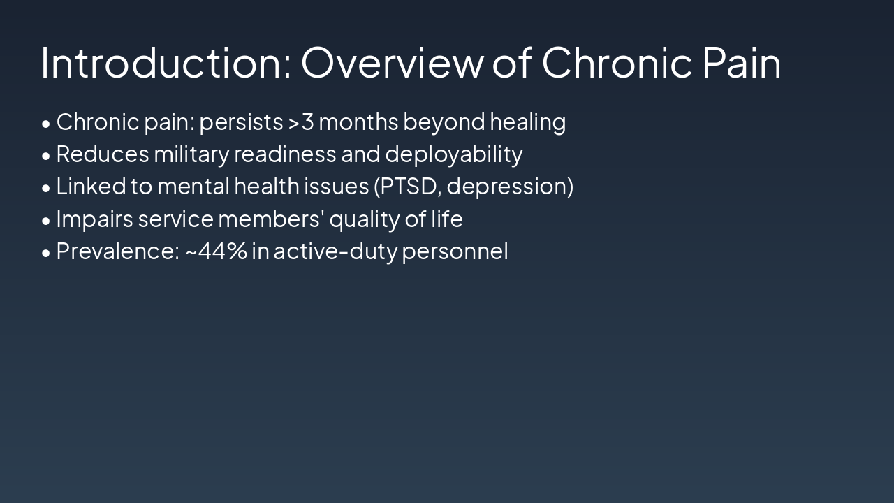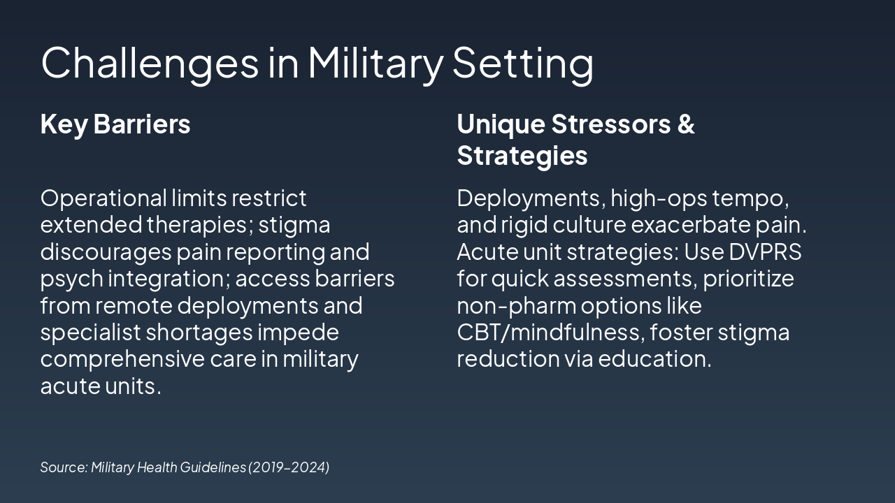 Highlight evidence-based pharmacologic options for chronic pain in military patients; emphasize cautious opioid use.