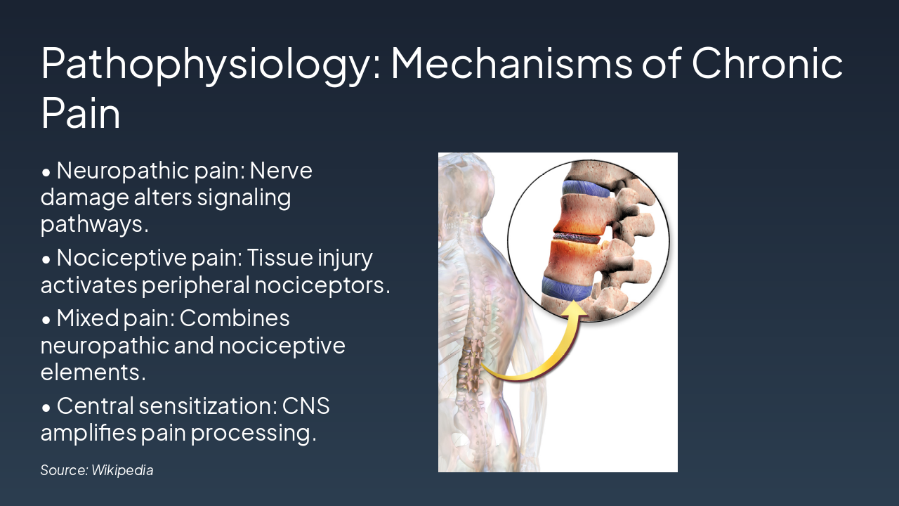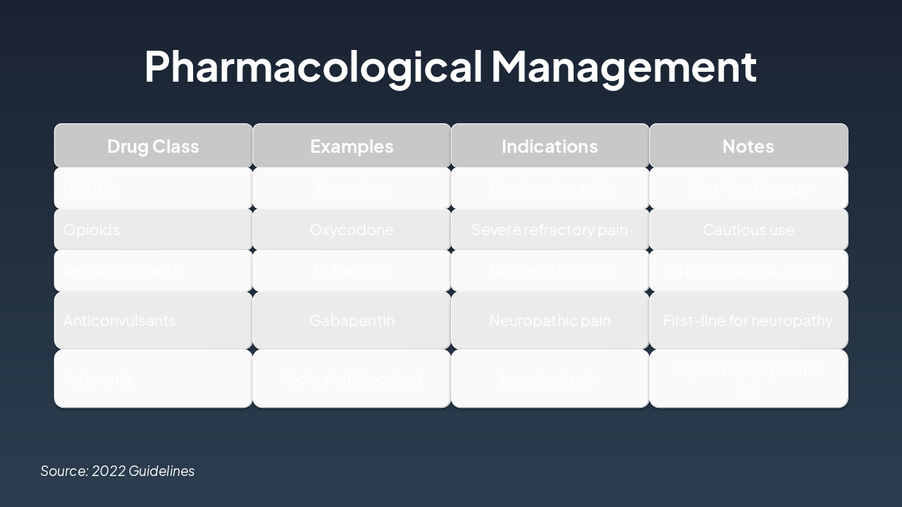 { "headers": [ "Drug Class", "Examples", "Indications", "Notes" ], "rows": [ [ "NSAIDs", "Ibuprofen", "Nociceptive pain", "First-line therapy" ], [ "Opioids", "Oxycodone", "Severe refractory pain", "Cautious use" ], [ "Antidepressants", "Duloxetine", "Neuropathic pain", "SNRI, evidence-based" ], [ "Anticonvulsants", "Gabapentin", "Neuropathic pain", "First-line for neuropathy" ], [ "Adjuvants", "Topicals (Lidocaine)", "Localized pain", "Adjunct, low systemic risk" ] ] }