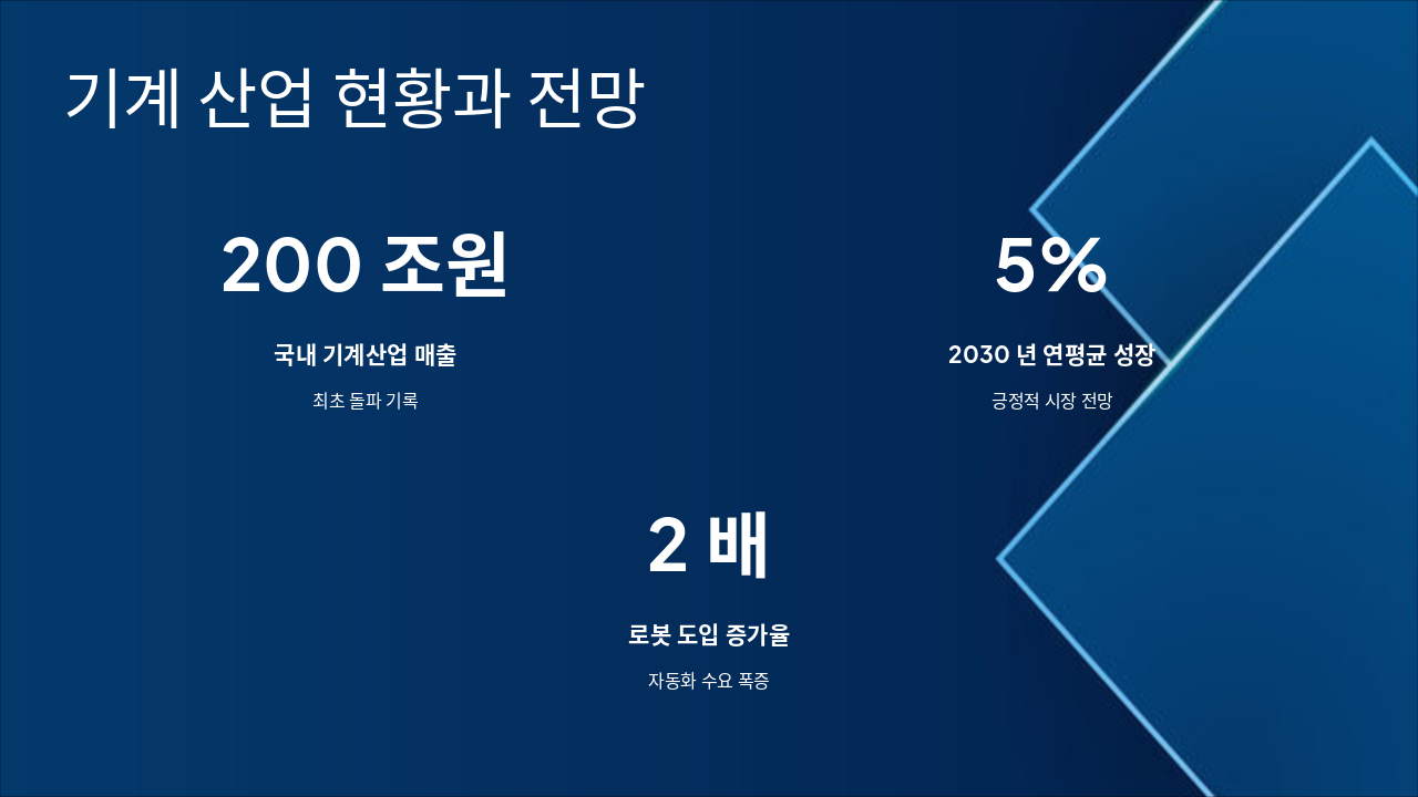 국내 기계산업 매출이 200조원을 최초로 돌파했다. 2030년 연평균 5% 성장과 로봇 도입 2배 증가로 긍정적 시장 전망이다.