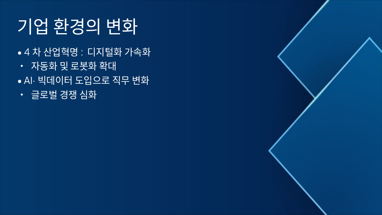 기업 환경은 4차 산업혁명으로 디지털화 가속화와 자동화·로봇화 확대를 겪고 있다. AI·빅데이터 도입으로 직무 변화가 발생하며 글로벌 경쟁이 심화되고 있다.