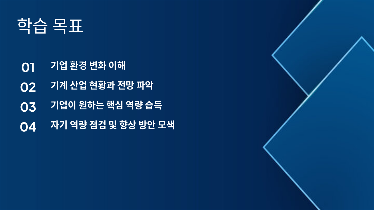 이 슬라이드는 학습 목표를 제시하며, 기업 환경 변화 이해와 기계 산업 현황·전망 파악을 포함한다. 또한 기업이 원하는 핵심 역량 습득과 자기 역량 점검·향상 방안 모색을 목표로 한다.