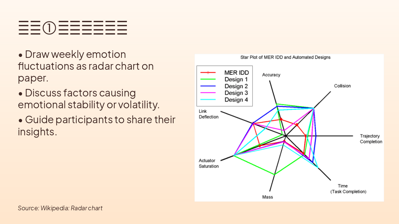 This slide, titled "互动①:心态雷达图" (Interaction 1: Mindset Radar Chart), instructs participants to draw weekly emotion fluctuations as a radar chart on paper. It guides discussion of factors causing emotional stability or volatility, followed by sharing personal insights.
