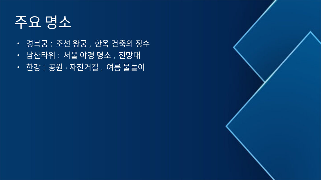 이 슬라이드는 서울의 주요 명소를 소개하며, 경복궁(조선 왕궁이자 한옥 건축의 정수), 남산타워(야경과 전망대 명소), 한강(공원, 자전거길, 여름 물놀이)을 나열한다. 각 명소의 핵심 특징을 간략히 강조한 bullet 포인트 형식이다.