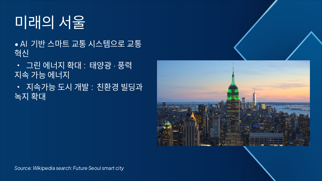 서울을 소개하는 5장짜리 프레젠테이션을 만들어 주세요. 슬라이드 구성은 다음과 같습니다: 1. 표지 - 제목 '서울(Seoul)', 부제 '대한민국의 심장', 서울 전경 이미지 포함. 2. 서울 개요 - 위치, 인구, 역사 간단 소개. 3. 주요 명소 - 경복궁, 남산타워, 한강 등 대표 관광지 소개. 4. 문화와 음식 - 서울의 전통문화와 현대적인 문화, 대표 음식(김치, 비빔밥 등). 5. 미래의 서울 - 스마트시티, 지속가능한 발전 방향 등. 스타일은 화이트 배경에 블루 포인트가 들어간 모던 & 클린한 비즈니스 스타일로 만들어 주세요.