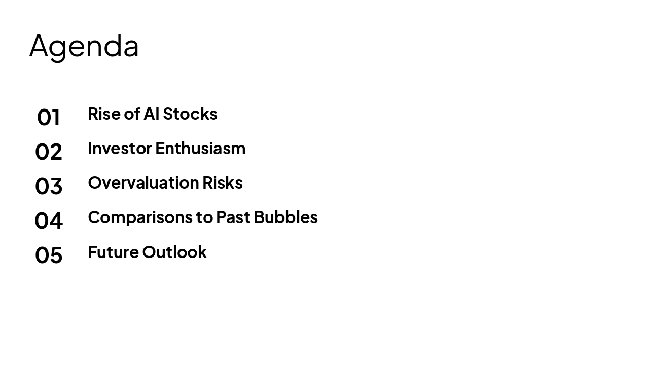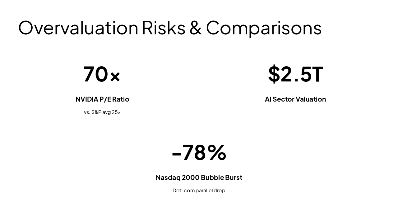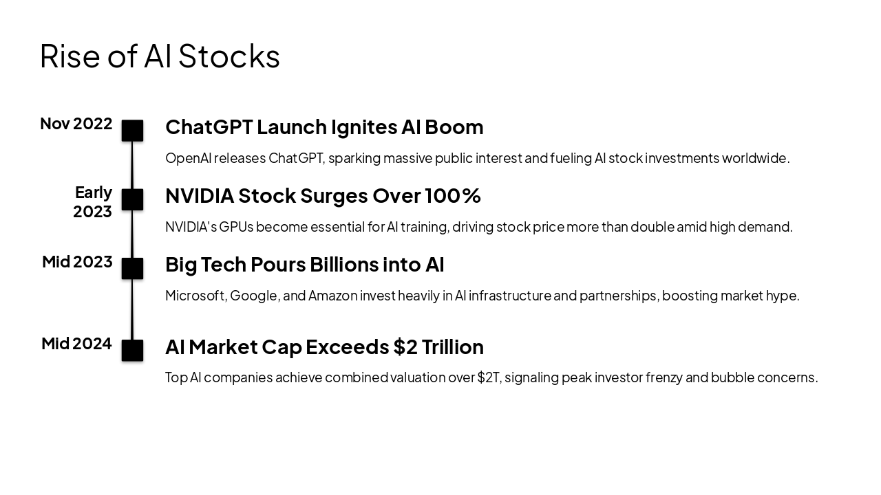 Nov 2022: ChatGPT Launch Ignites AI Boom OpenAI releases ChatGPT, sparking massive public interest and fueling AI stock investments worldwide. Early 2023: NVIDIA Stock Surges Over 100% NVIDIA's GPUs become essential for AI training, driving stock price more than double amid high demand. Mid 2023: Big Tech Pours Billions into AI Microsoft, Google, and Amazon invest heavily in AI infrastructure and partnerships, boosting market hype. Mid 2024: AI Market Cap Exceeds $2 Trillion Top AI companies achieve combined valuation over $2T, signaling peak investor frenzy and bubble concerns.
