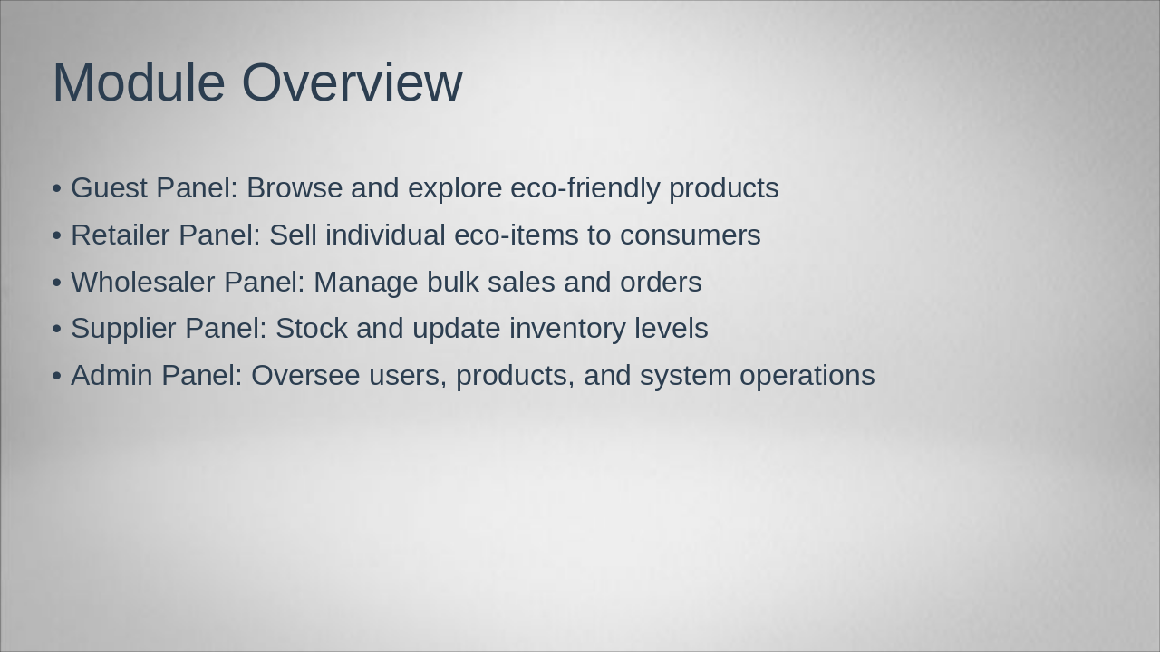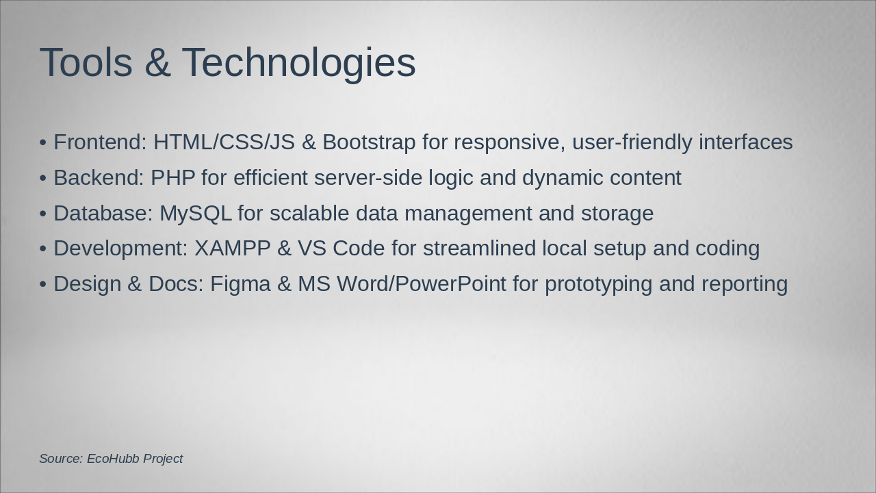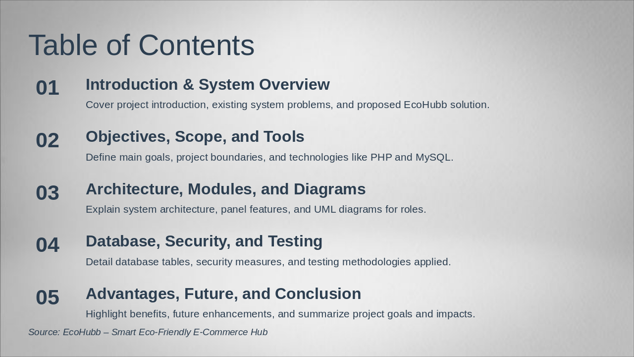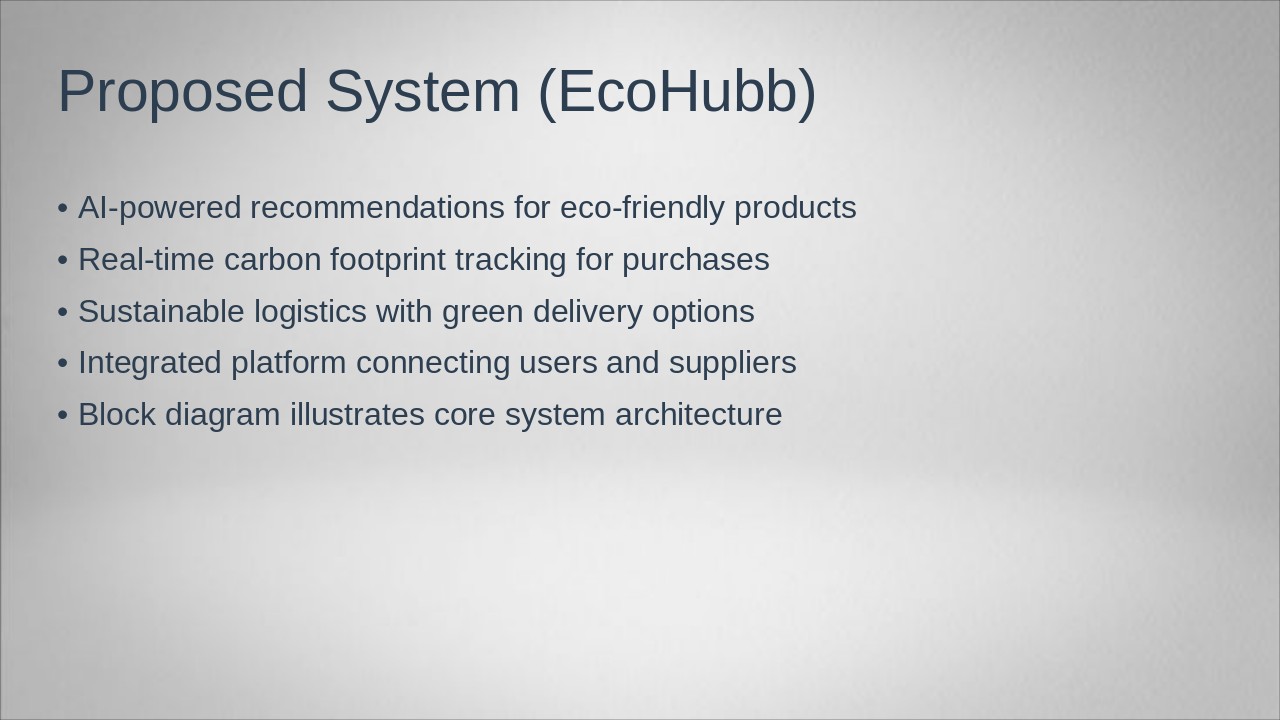 Cover project introduction, existing system problems, and proposed EcoHubb solution.