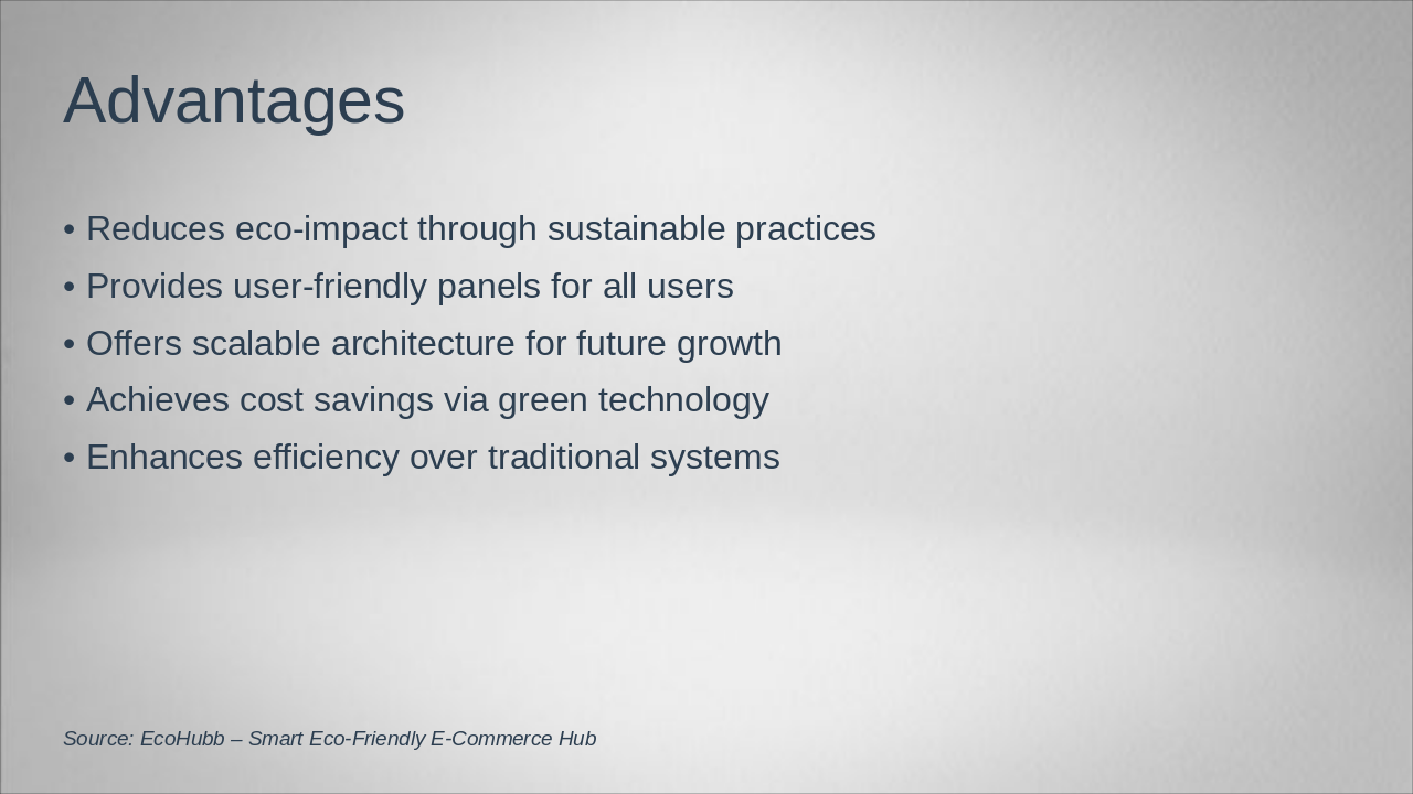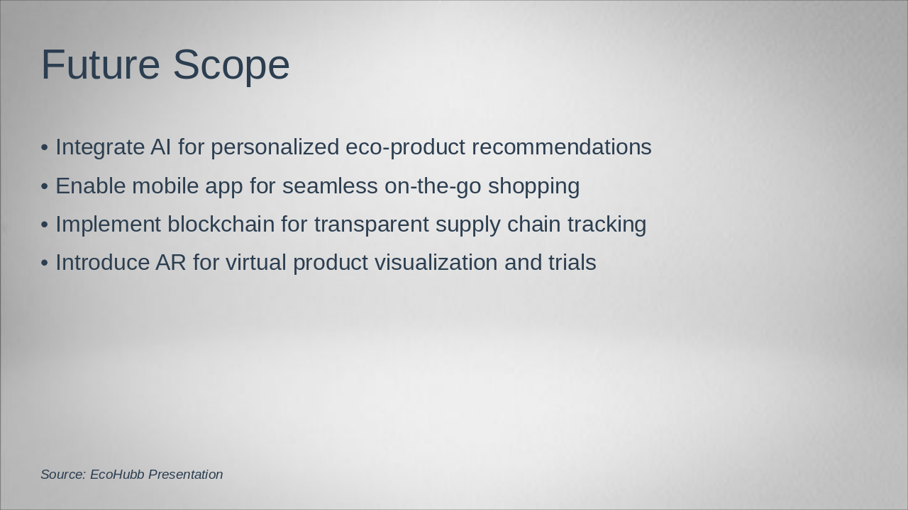 Highlight benefits, future enhancements, and summarize project goals and impacts. Source: EcoHubb – Smart Eco-Friendly E-Commerce Hub