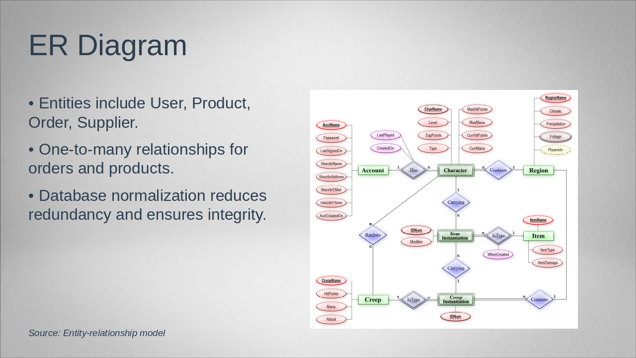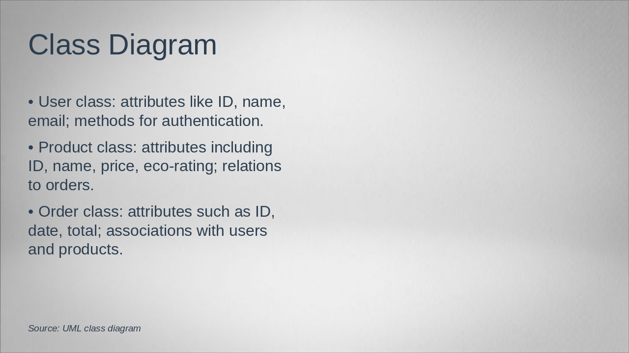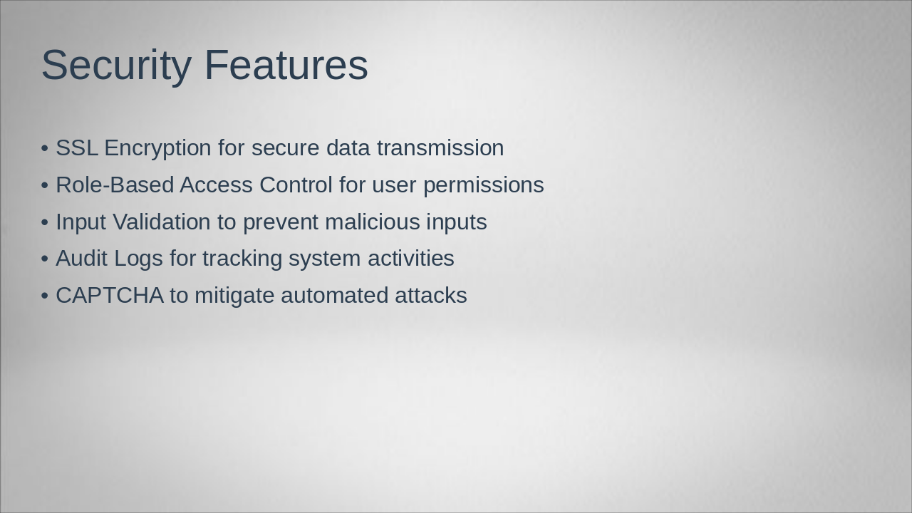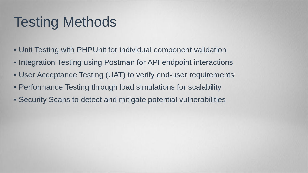 Detail database tables, security measures, and testing methodologies applied.
