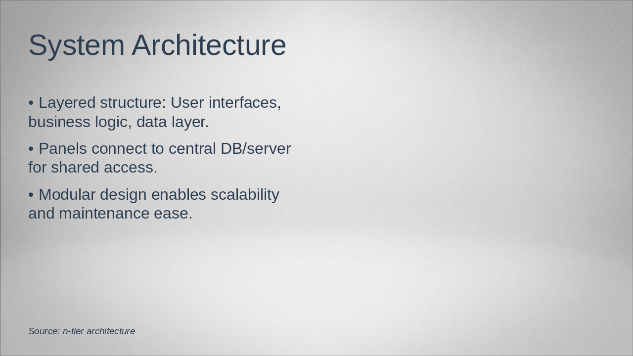 Explain system architecture, panel features, and UML diagrams for roles.
