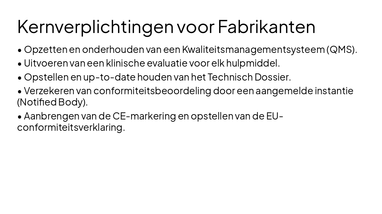 Overzicht van de EU MDR Verordening 2017/745: kernverplichtingen voor fabrikanten, inclusief kwaliteitsmanagementsysteem, technisch dossier, klinische evaluatie, markttoegang en post-market surveillance.