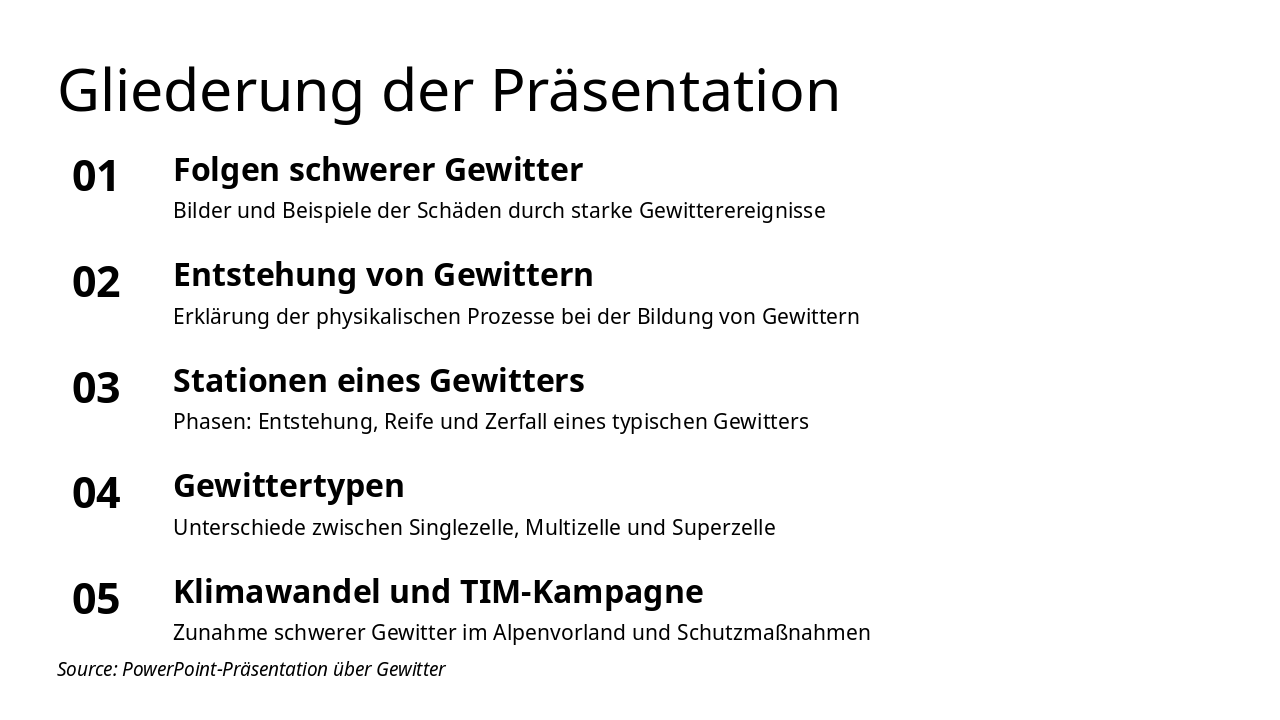 The presentation agenda outlines key topics on thunderstorms, starting with the consequences of severe storms, including images and examples of damage from intense events. It then covers thunderstorm formation processes, the stages of development (initiation, maturity, and decay), types such as single-cell, multicell, and supercell, and the impacts of climate change on increased storms in the Alpine foreland along with protective measures from the TIM campaign.