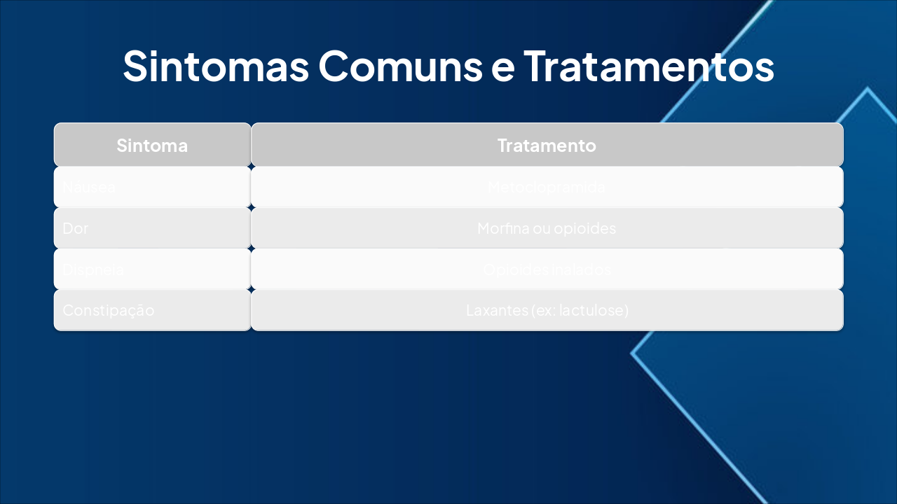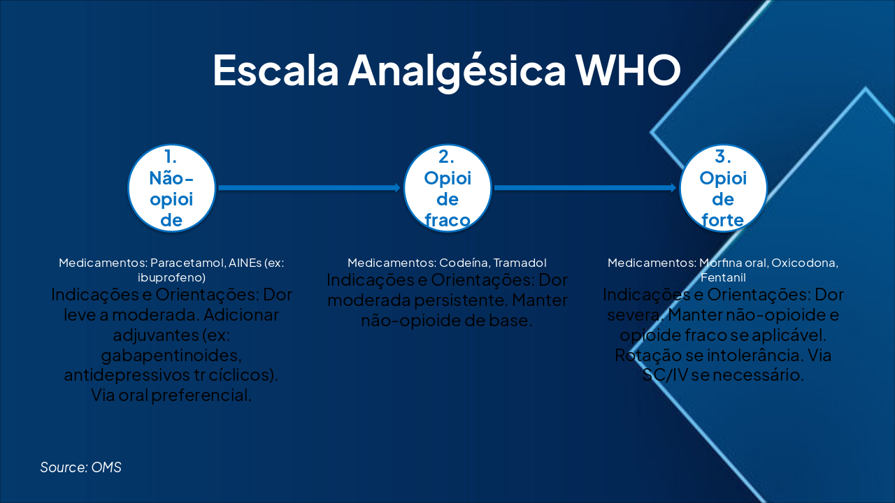{ "headers": [ "Etapa", "Medicamentos", "Indicações e Orientações" ], "rows": [ [ "1. Não-opioide", "Paracetamol, AINEs (ex: ibuprofeno)", "Dor leve a moderada. Adicionar adjuvantes (ex: gabapentinoides, antidepressivos tr cíclicos). Via oral preferencial." ], [ "2. Opioide fraco", "Codeína, Tramadol", "Dor moderada persistente. Manter não-opioide de base." ], [ "3. Opioide forte", "Morfina oral, Oxicodona, Fentanil", "Dor severa. Manter não-opioide e opioide fraco se aplicável. Rotação se intolerância. Via SC/IV se necessário." ] ] }