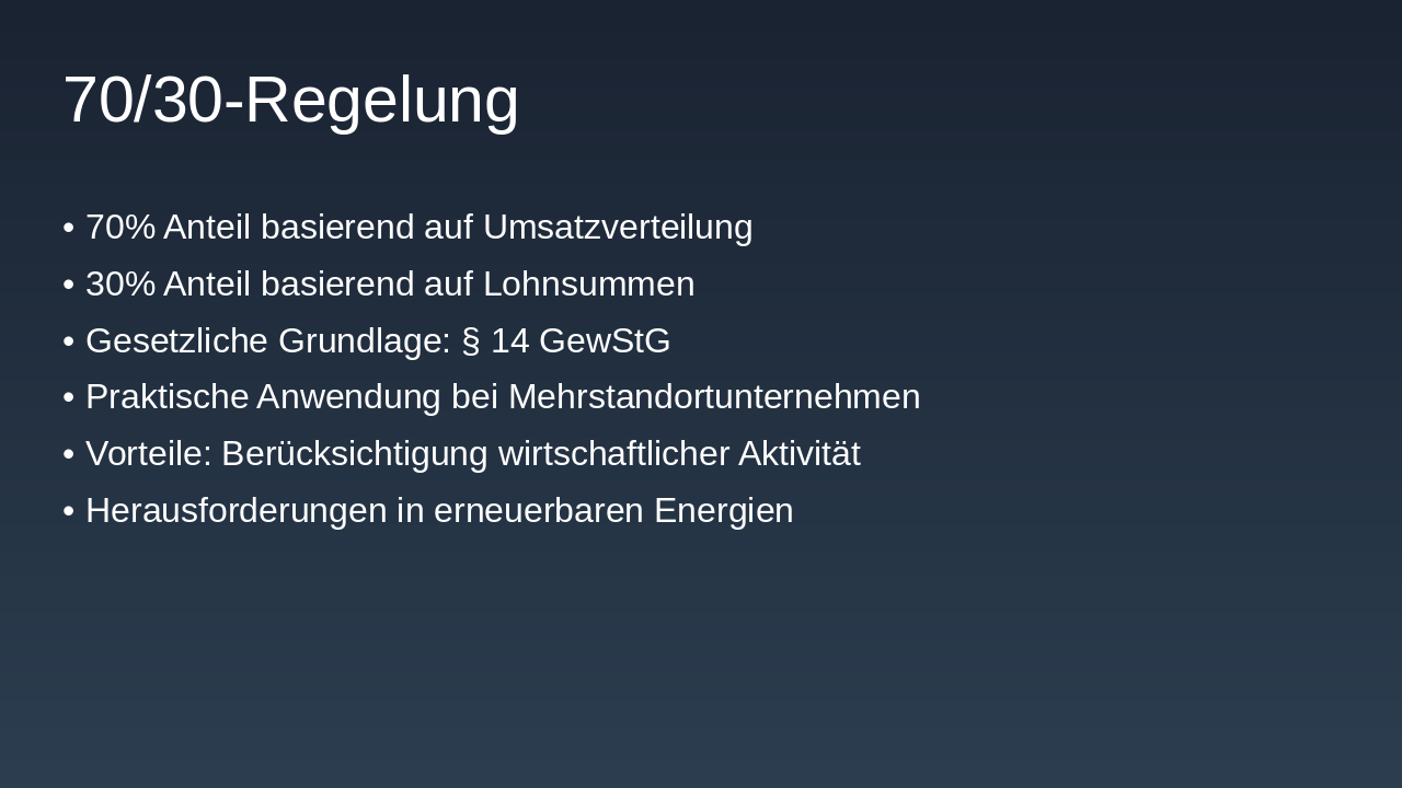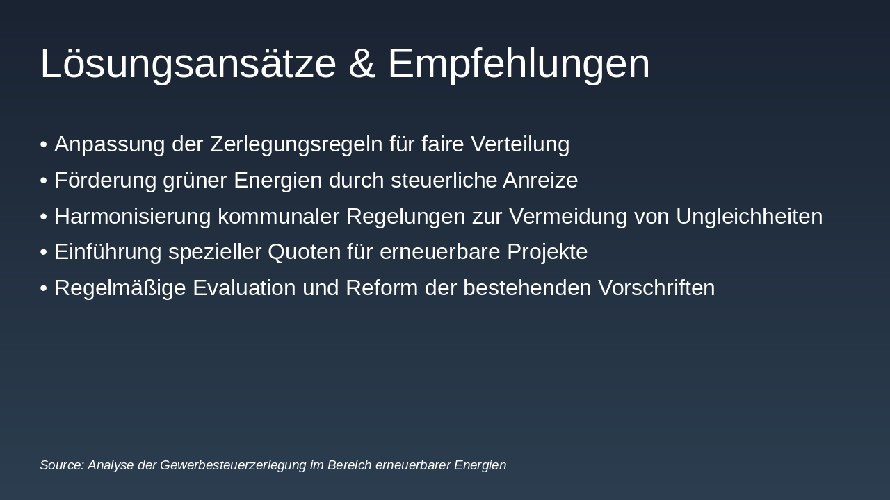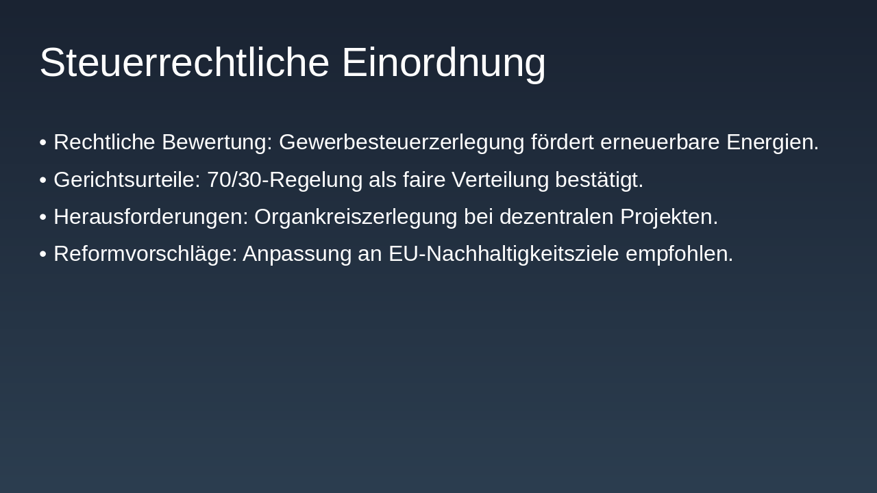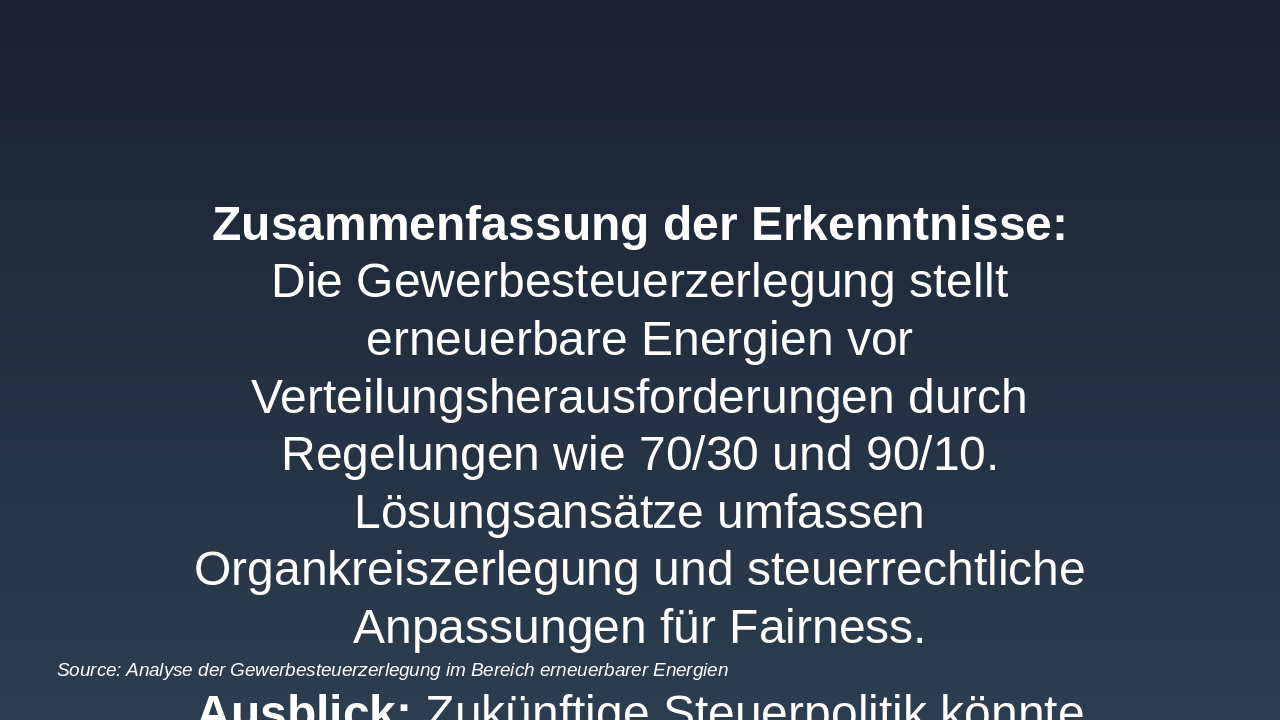 **Zusammenfassung der Erkenntnisse: Die Gewerbesteuerzerlegung stellt erneuerbare Energien vor Verteilungsherausforderungen durch Regelungen wie 70/30 und 90/10. Lösungsansätze umfassen Organkreiszerlegung und steuerrechtliche Anpassungen für Fairness.