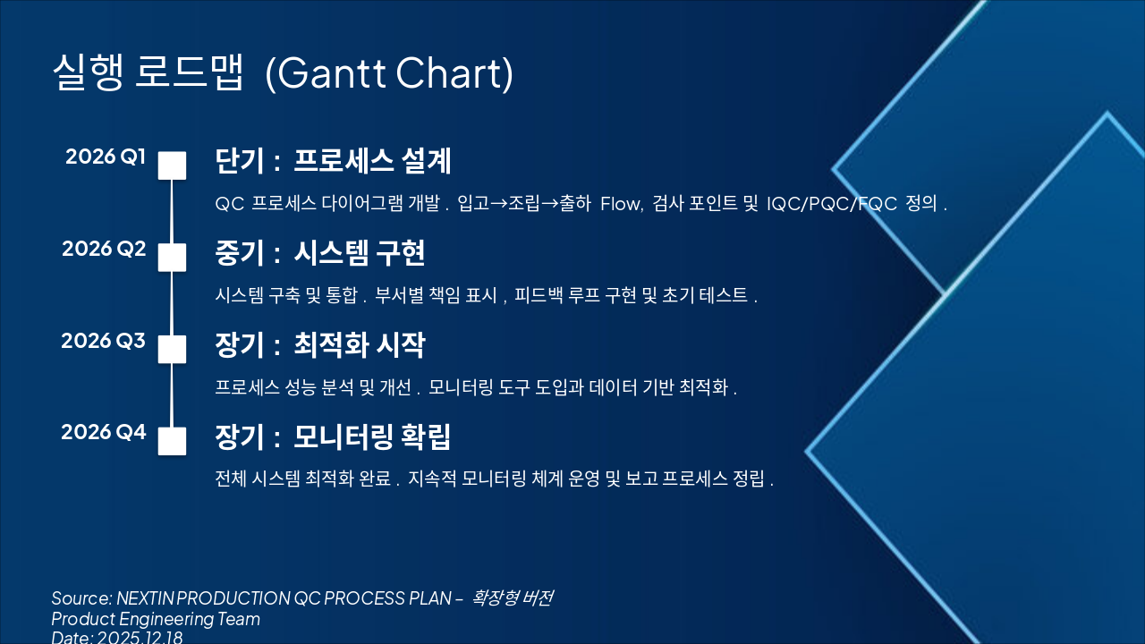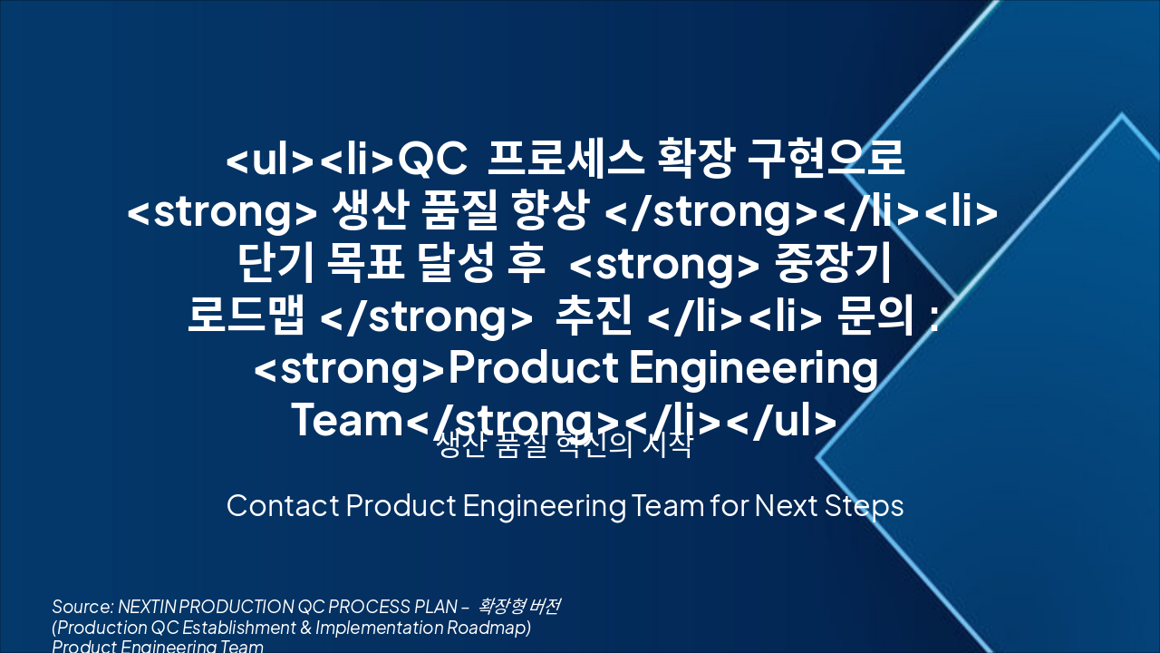 NEXTIN PRODUCTION QC PROCESS PLAN – 확장형 버전 (Production QC Establishment & Implementation Roadmap) Product Engineering Team Date : 2025.12.18 추가 내용: 1. QC 프로세스 상세 다이어그램 (입고→조립→출하 단계별 Flow + 책임 부서 표시) - 단계별 검사 포인트 및 피드백 루프 시각화 - IQC / PQC / FQC 구분 명시 2. 실행 로드맵 시각화 (Gantt Chart 스타일) - 단기 / 중기 / 장기 구간 구분 - 주요 Task별 일정 Bar 표시 3. 기존 13개 슬라이드 기반 유지 + 확장형 슬라이드 2~3장 추가 스타일 가이드: - NEXTIN 공식 템플릿 기반 - NEXTIN 블루 (#004A8F) 중심 포인트 컬러 - 프로세스 다이어그램: 화살표형 플로우 + 단계별 박스 - 로드맵: Gantt Chart 형태, 분기별 타임라인 표시 - 전반적 톤은 기술/공정 중심의 프로페셔널 비주얼