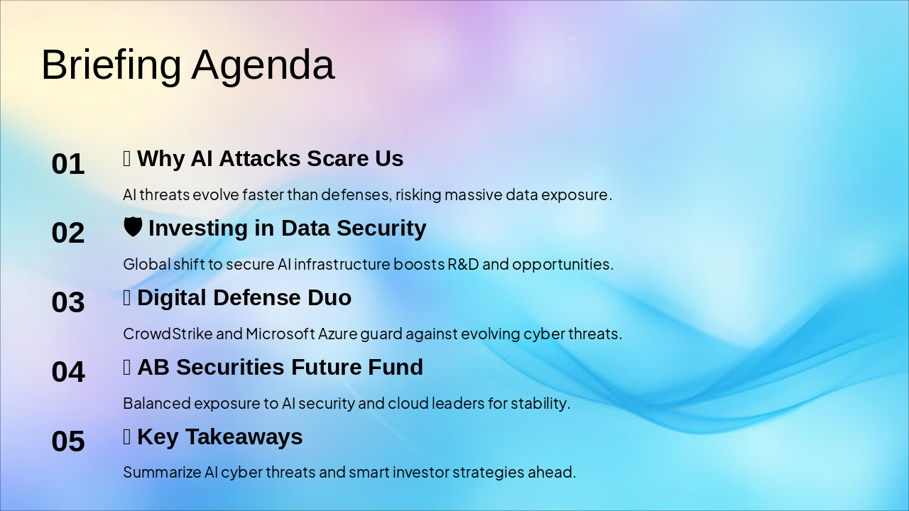 Title: Officer Clawhauser’s Urgent Briefing: The AI Cyber Threat & Smart Investment Moves Theme: Light, illustrated visuals — blending Zootopia-inspired charm with AI cybersecurity and finance motifs. Tone: Urgent, witty, investor-focused. Slide 1: Why AI Cyber Attacks Are Scarier Than a Night Howler - Illustrated: Clawhauser pointing at a glowing AI brain icon and warning the room. - “Oh sweet cheese — they learn!” - AI threats evolve faster than traditional defenses. - Massive data exposure = juicier targets. - Even big networks can be caught off guard. Slide 2: Closing the Gap: Investing in Data Security - Illustrated: futuristic city with shield icons and secure data flows. - Global focus shifting to secure AI infrastructure. - Major R&D spending uptick in cybersecurity. - Investors are watching the gap — and the opportunity. Slide 3: How to Gain Exposure: The Digital Defense Duo - Illustrated: two characters labeled CrowdStrike & Microsoft Azure standing guard over servers. - CrowdStrike (CRWD): The frontline AI defender. - Microsoft Azure: Powering secure cloud ecosystems. - Optional 3rd pick: SentinelOne or Palo Alto Networks for extra armor. Slide 4: AB Securities: The Future Fund - Illustrated: Clawhauser presenting a holographic investment dashboard. - Offers balanced exposure to AI security & cloud leaders. - Designed for investors who want innovation with stability. - “We’re not chasing night howlers — we’re backing the ones building better fences!”