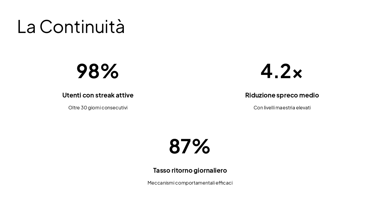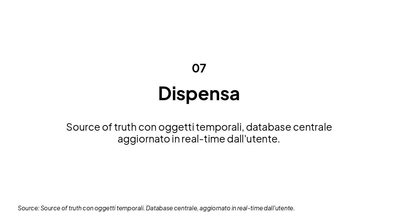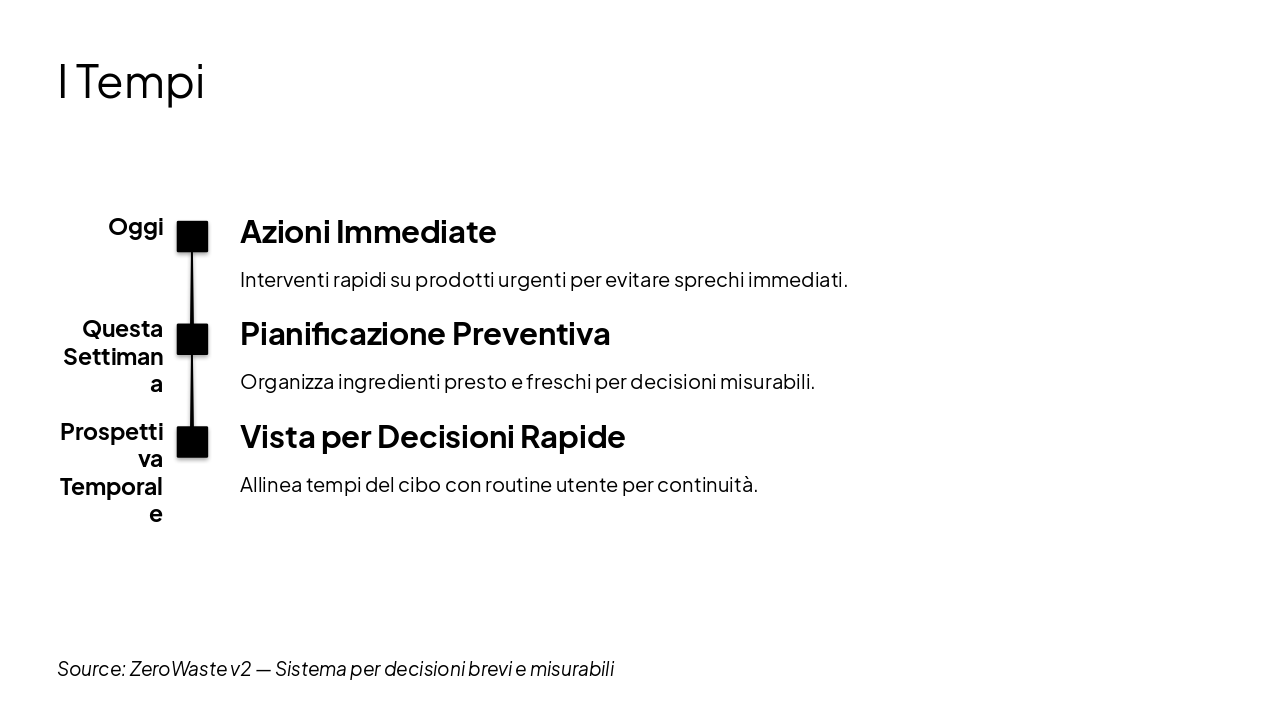 La slide "I Tempi" presenta una timeline con tre fasi: oggi, con azioni immediate per interventi rapidi su prodotti urgenti ed evitare sprechi; questa settimana, focalizzata sulla pianificazione preventiva per organizzare ingredienti freschi e decisioni misurabili. Infine, nella prospettiva temporale, offre una vista per decisioni rapide, allineando i tempi del cibo con le routine utente per garantire continuità.