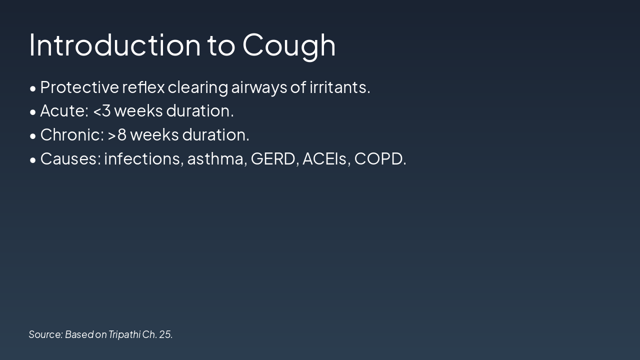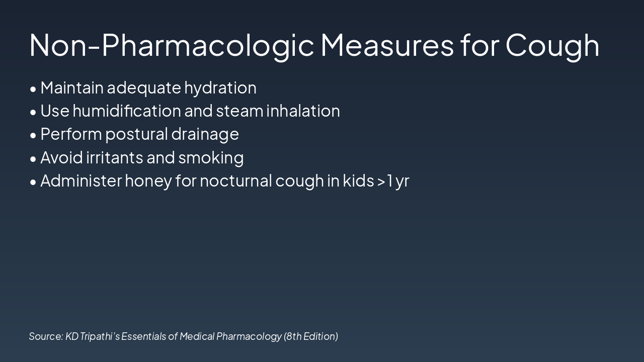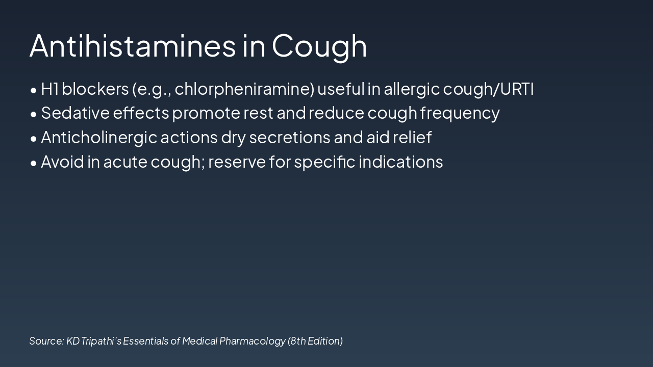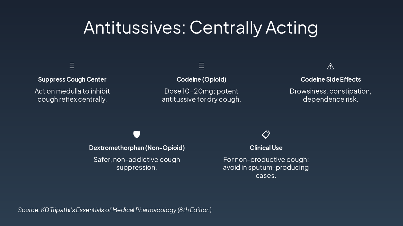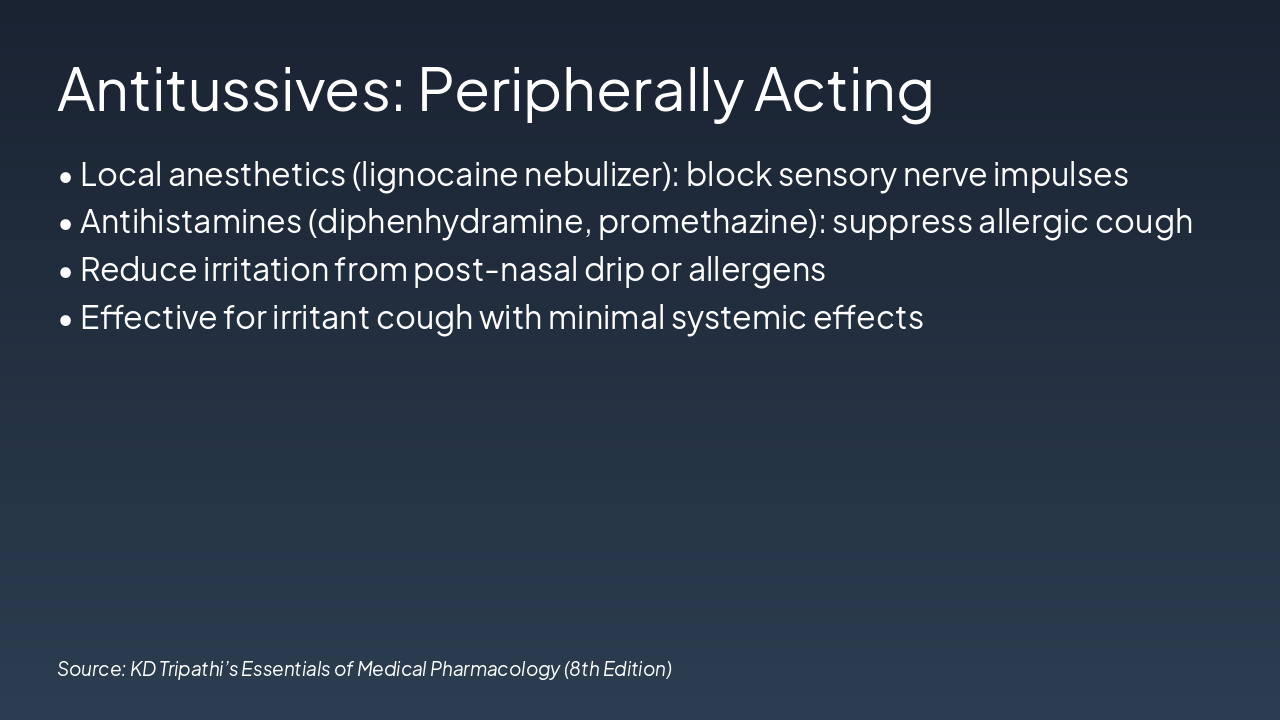 Mucolytics: Reduce mucus viscosity. Bromhexine/AMB: depolymerize mucopolysaccharides; Acetylcysteine: mucolytic via SH groups.