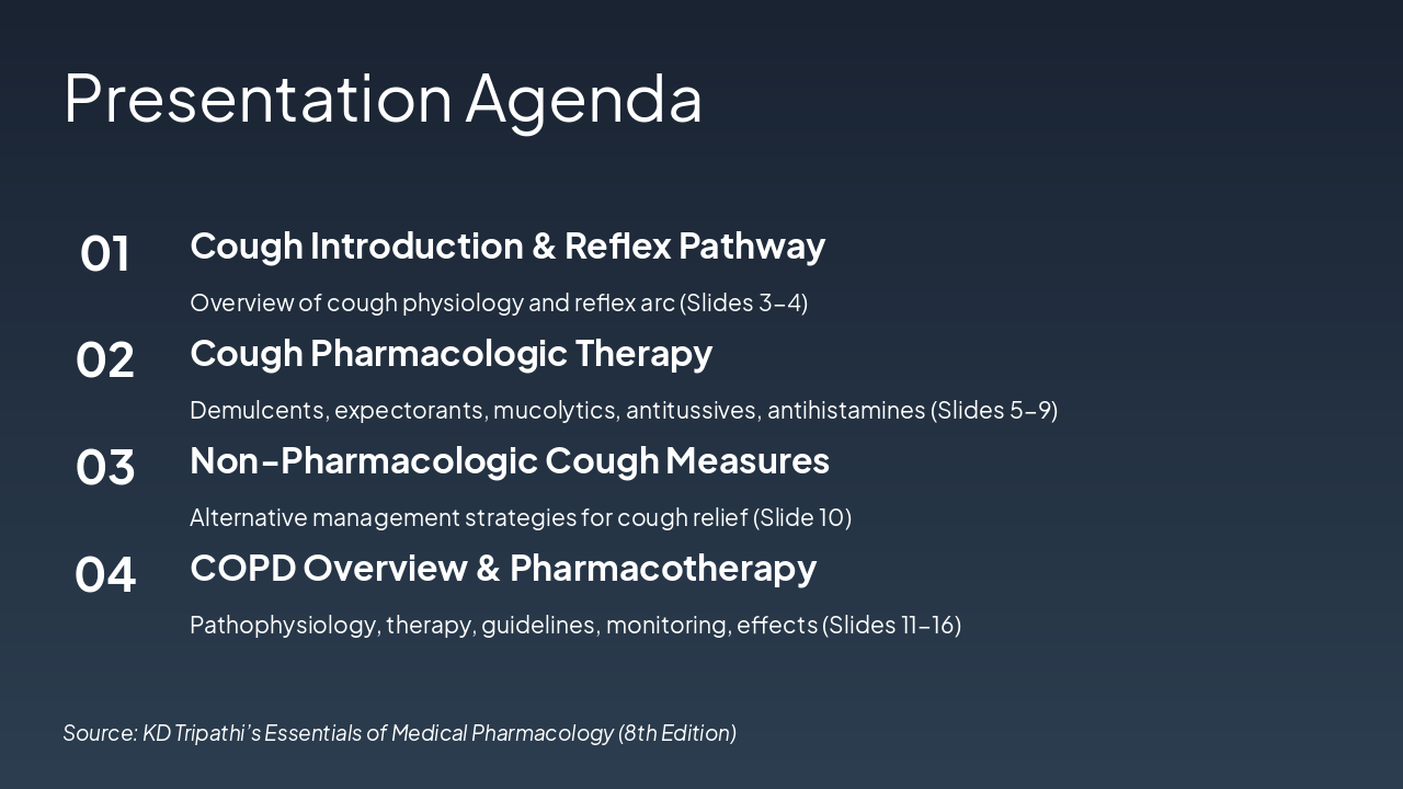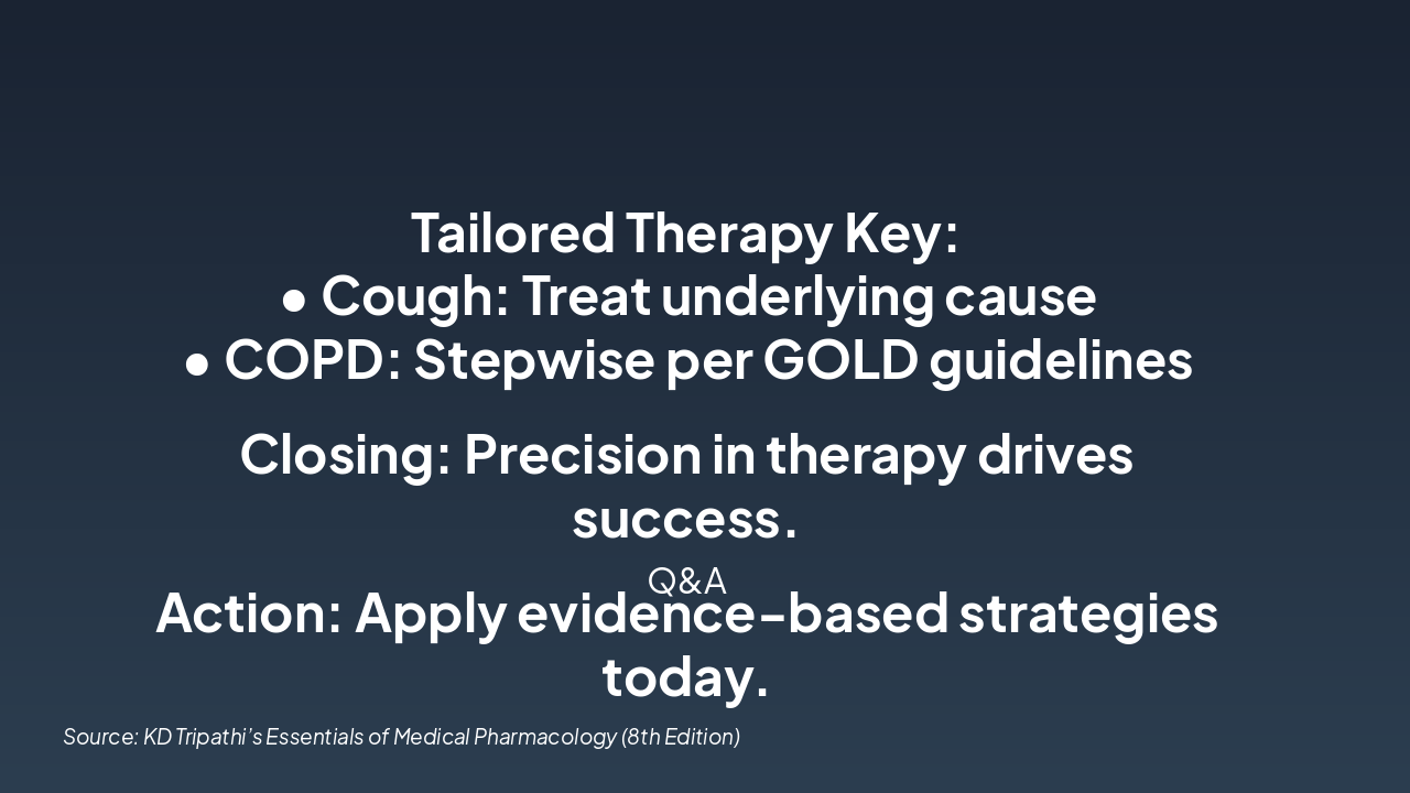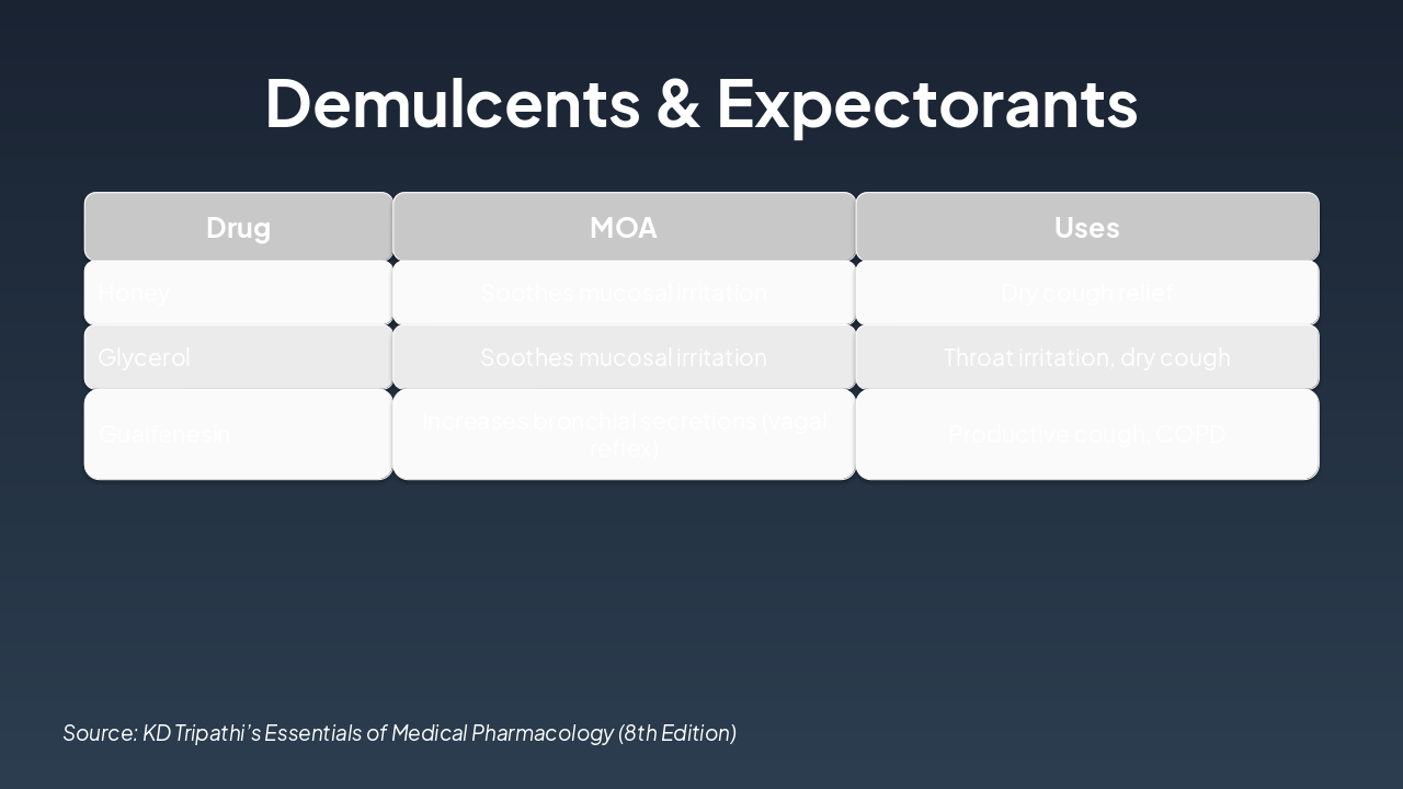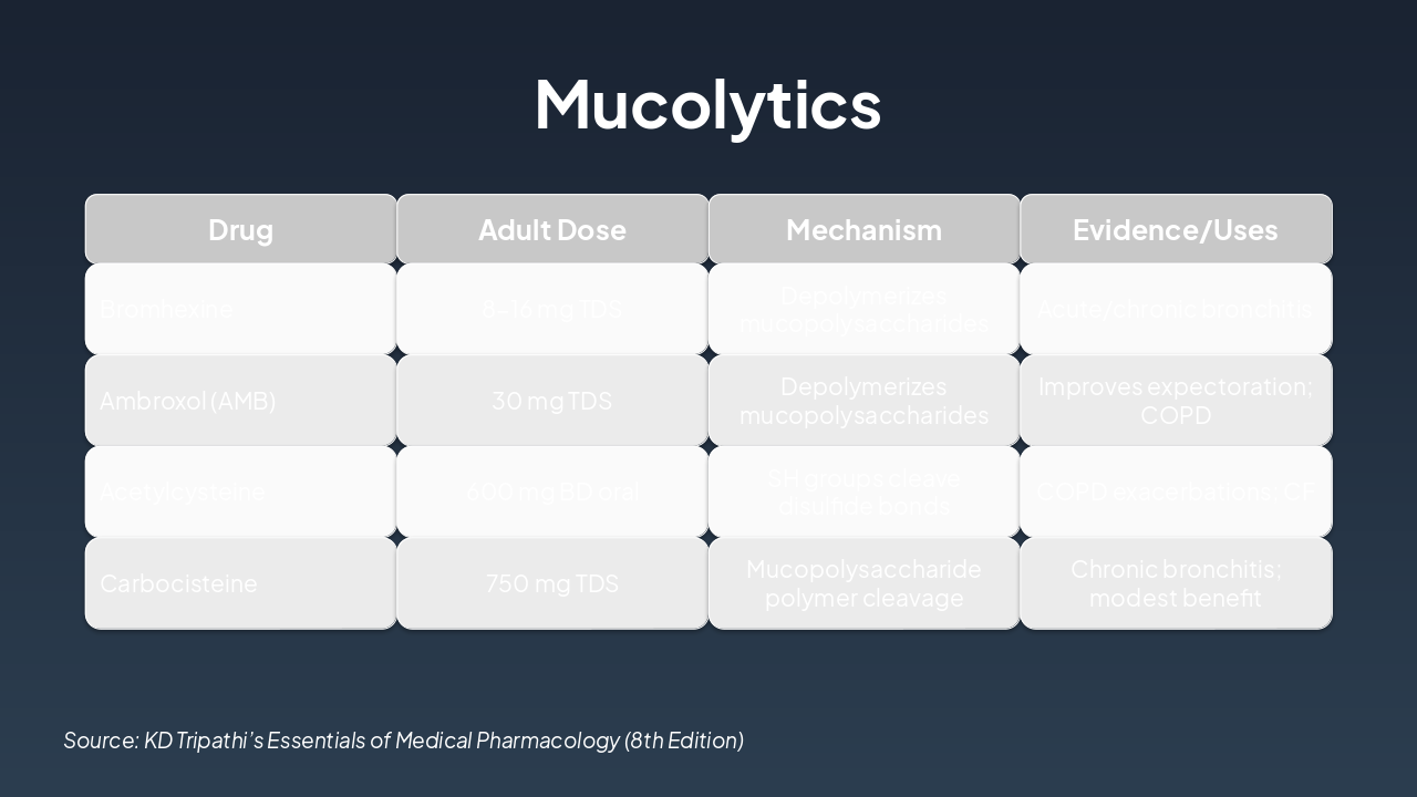 This slide features a table on mucolytics, listing drugs like Bromhexine (8-16 mg TDS), Ambroxol (30 mg TDS), Acetylcysteine (600 mg BD), and Carbocisteine (750 mg TDS) with their mechanisms and uses. Mechanisms include depolymerizing mucopolysaccharides or cleaving disulfide bonds, primarily for bronchitis, COPD exacerbations, and CF.