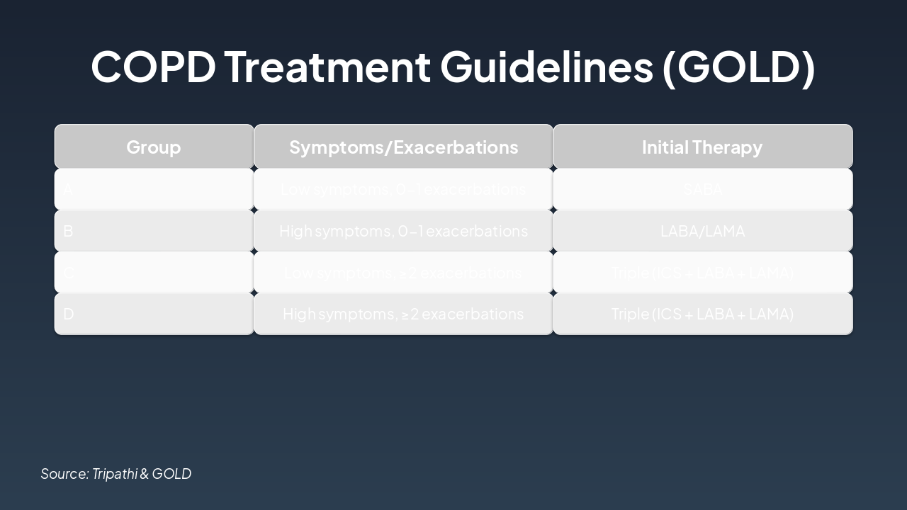 { "headers": [ "Drug", "Adult Dose", "Mechanism", "Evidence/Uses" ], "rows": [ [ "Bromhexine", "8-16 mg TDS", "Depolymerizes mucopolysaccharides", "Acute/chronic bronchitis" ], [ "Ambroxol (AMB)", "30 mg TDS", "Depolymerizes mucopolysaccharides", "Improves expectoration; COPD" ], [ "Acetylcysteine", "600 mg BD oral", "SH groups cleave disulfide bonds", "COPD exacerbations; CF" ], [ "Carbocisteine", "750 mg TDS", "Mucopolysaccharide polymer cleavage", "Chronic bronchitis; modest benefit" ] ] }