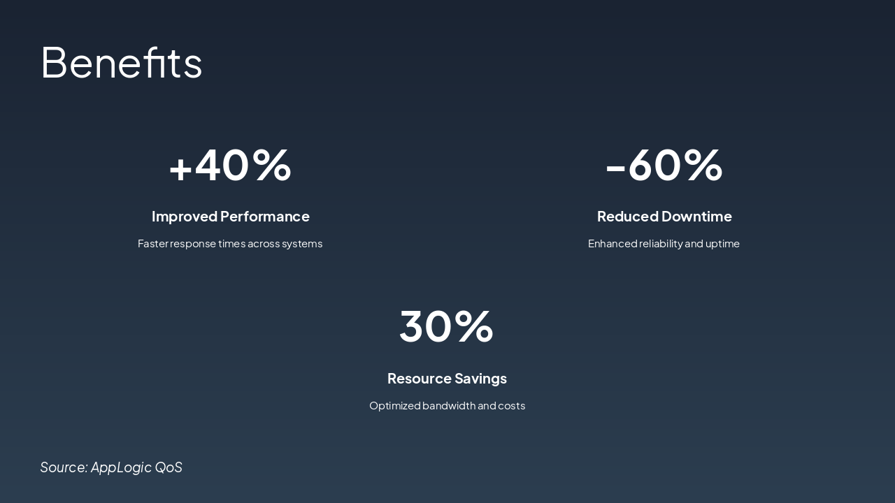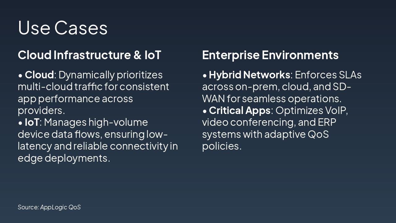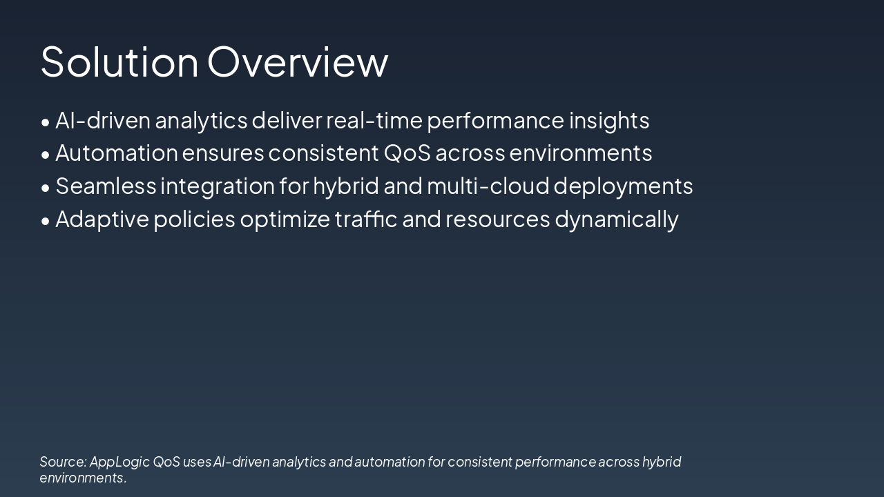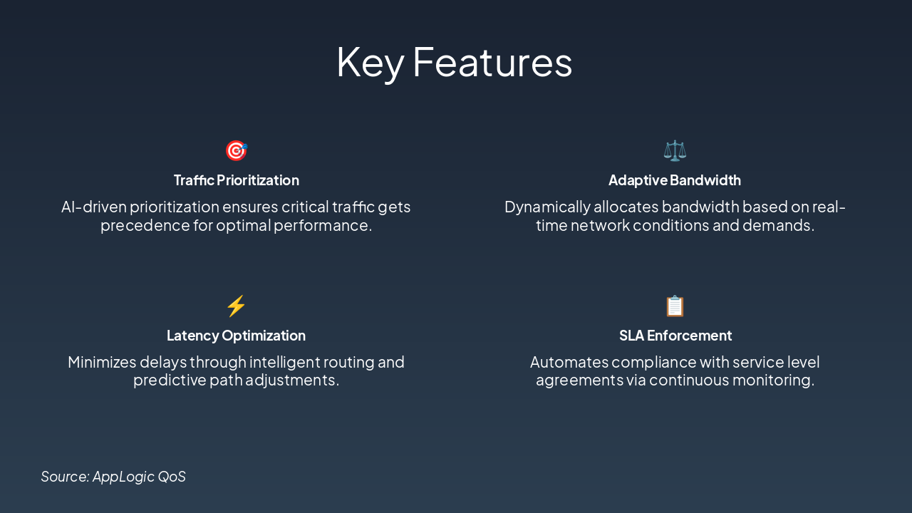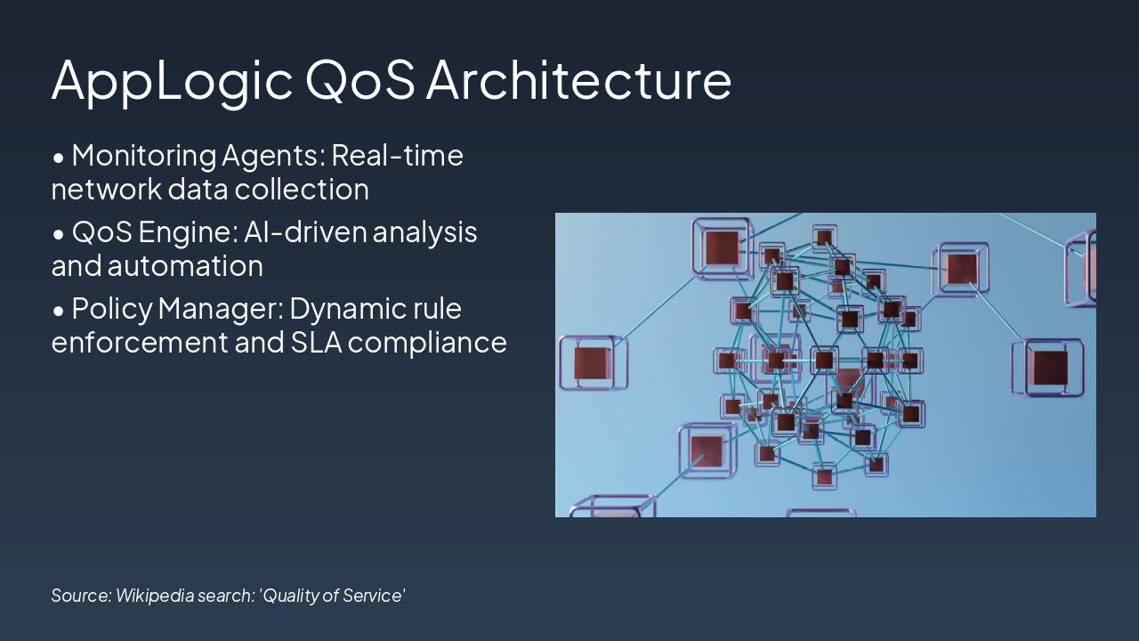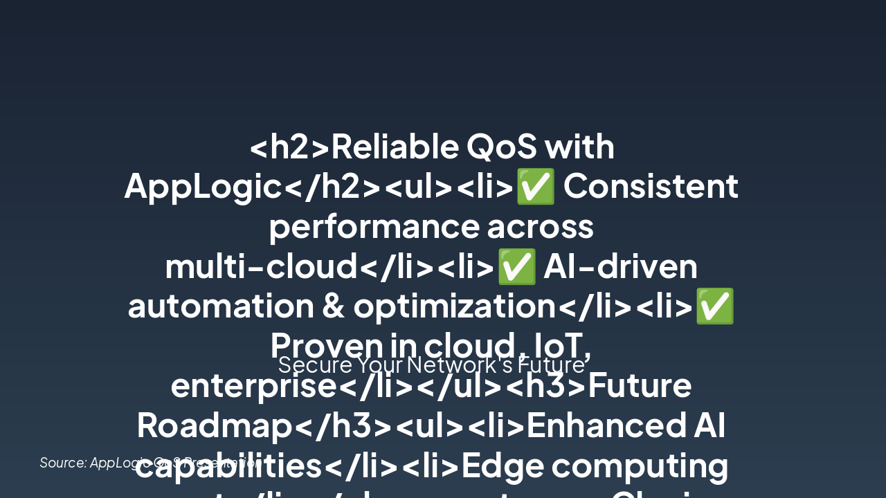 <h2>Reliable QoS with AppLogic</h2><ul><li>✅ Consistent performance across multi-cloud</li><li>✅ AI-driven automation & optimization</li><li>✅ Proven in cloud, IoT, enterprise</li></ul><h3>Future Roadmap</h3><ul><li>Enhanced AI capabilities</li><li>Edge computing support</li></ul><p><strong>Closing:</strong> Transform your QoS today!</p><p><strong>Call to Action:</strong> Contact us now to schedule a demo!</p>