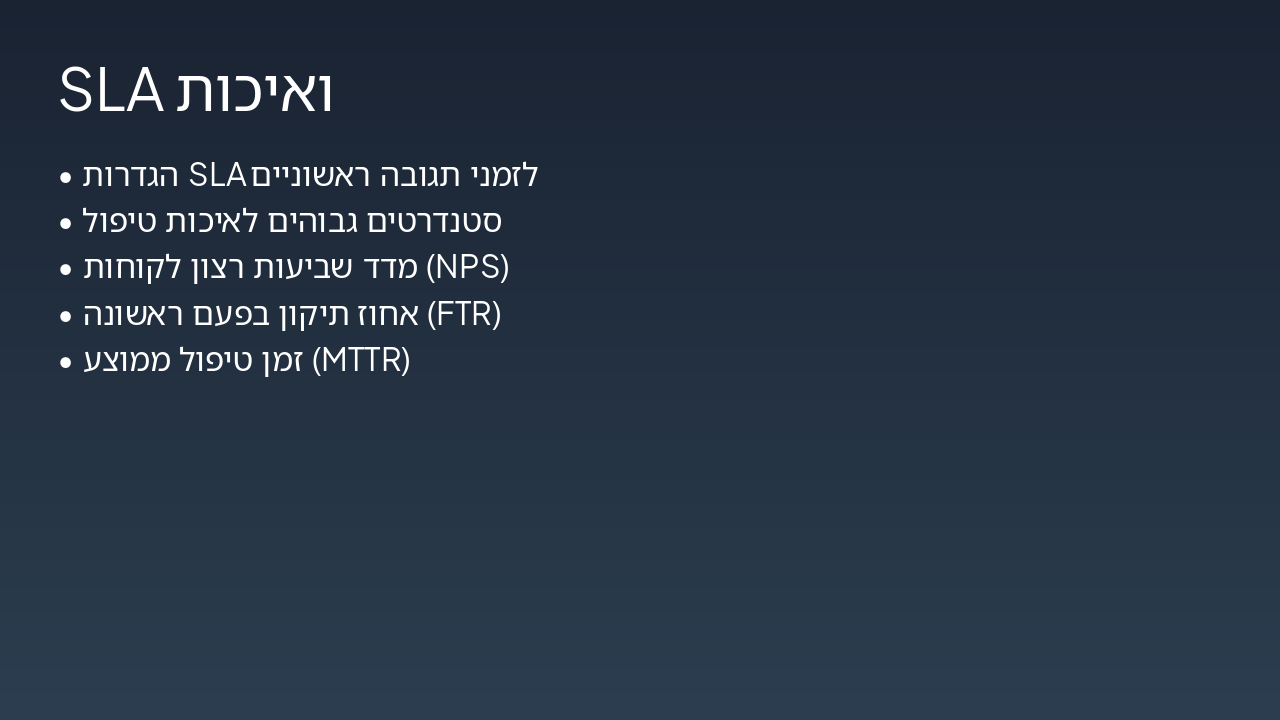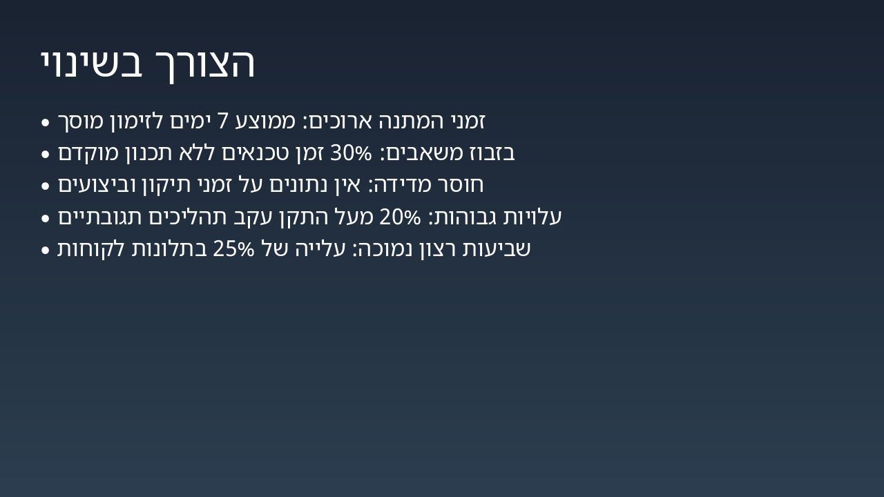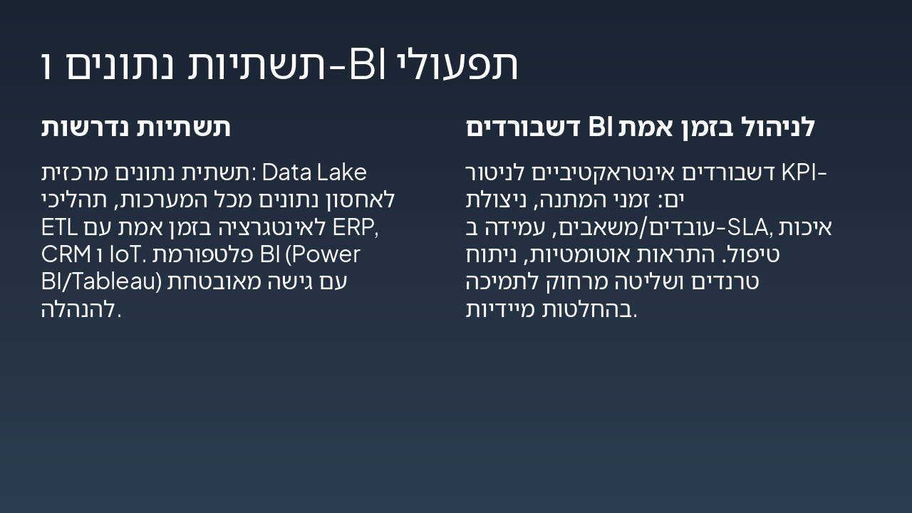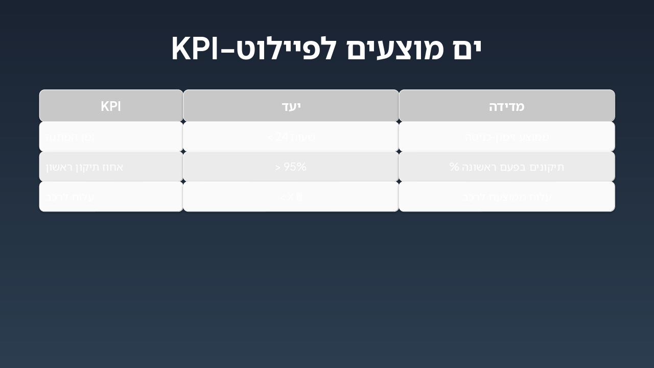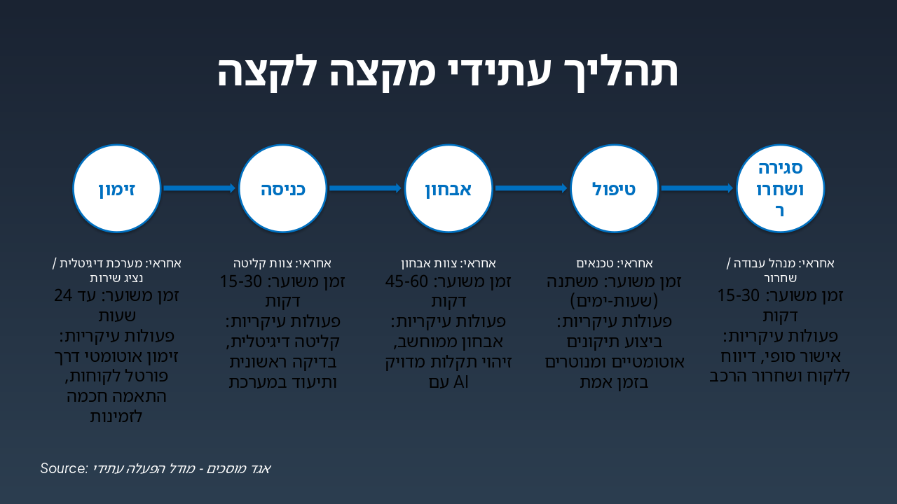{ "headers": [ "שלב", "אחראי", "זמן משוער", "פעולות עיקריות" ], "rows": [ [ "זימון", "מערכת דיגיטלית / נציג שירות", "עד 24 שעות", "זימון אוטומטי דרך פורטל לקוחות, התאמה חכמה לזמינות" ], [ "כניסה", "צוות קליטה", "15-30 דקות", "קליטה דיגיטלית, בדיקה ראשונית ותיעוד במערכת" ], [ "אבחון", "צוות אבחון", "45-60 דקות", "אבחון ממוחשב, זיהוי תקלות מדויק עם AI" ], [ "טיפול", "טכנאים", "משתנה (שעות-ימים)", "ביצוע תיקונים אוטומטיים ומנוטרים בזמן אמת" ], [ "סגירה ושחרור", "מנהל עבודה / שחרור", "15-30 דקות", "אישור סופי, דיווח ללקוח ושחרור הרכב" ] ] }