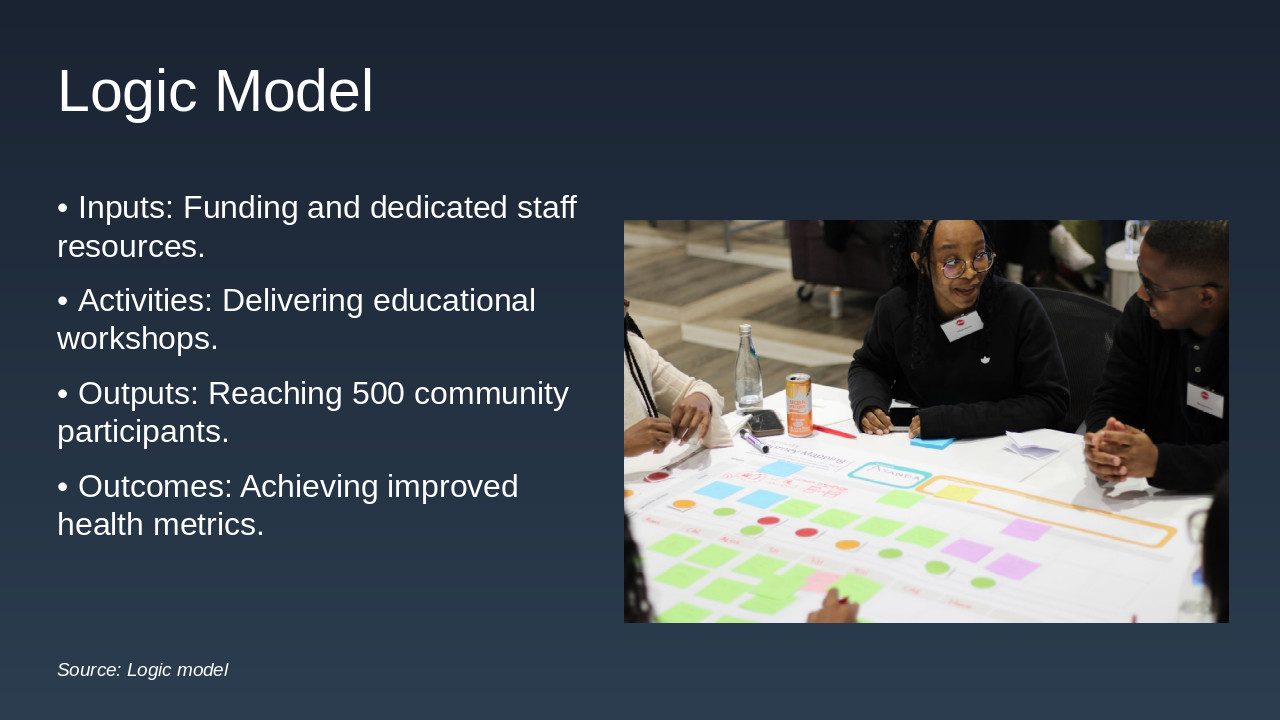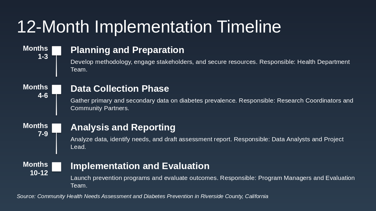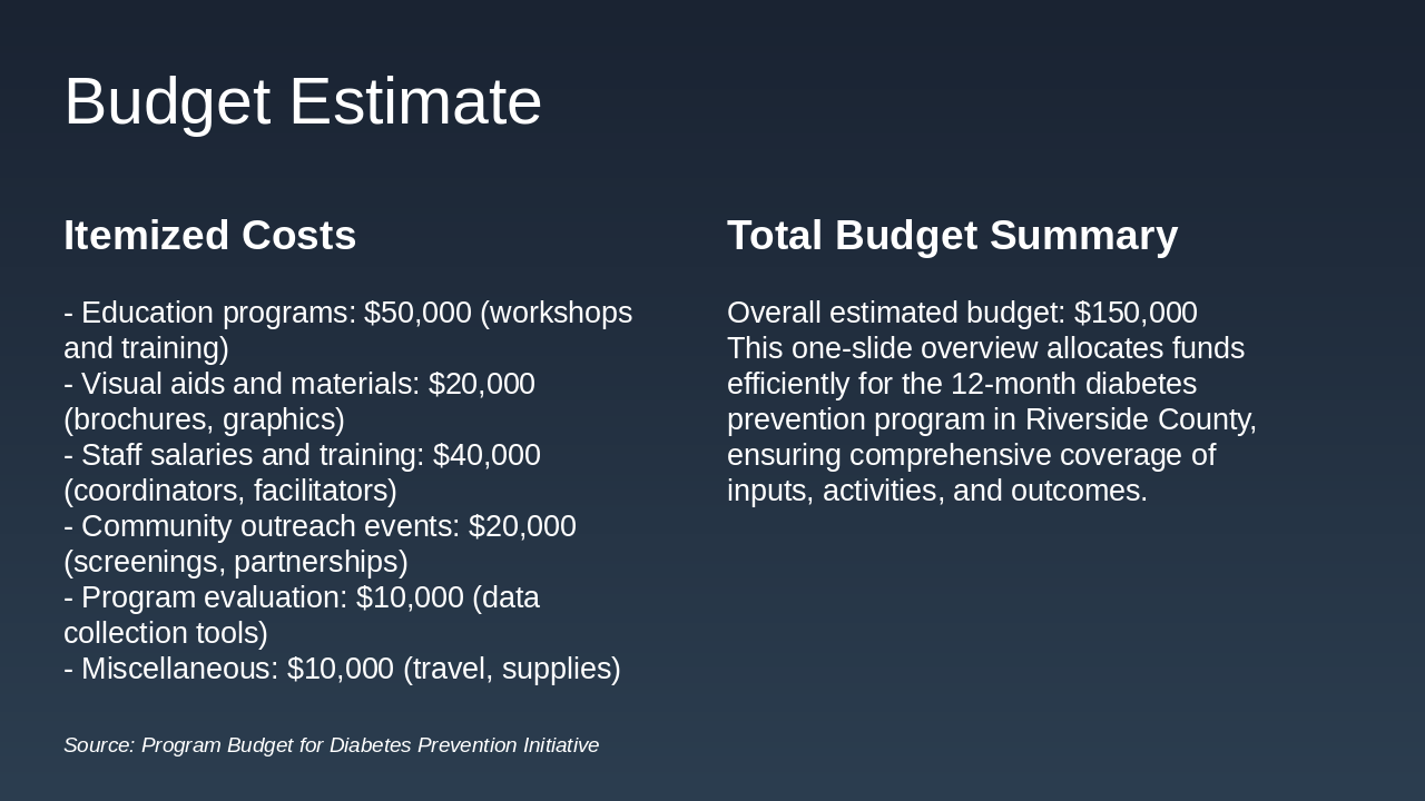 This one-slide overview allocates funds efficiently for the 12-month diabetes prevention program in Riverside County, ensuring comprehensive coverage of inputs, activities, and outcomes. |