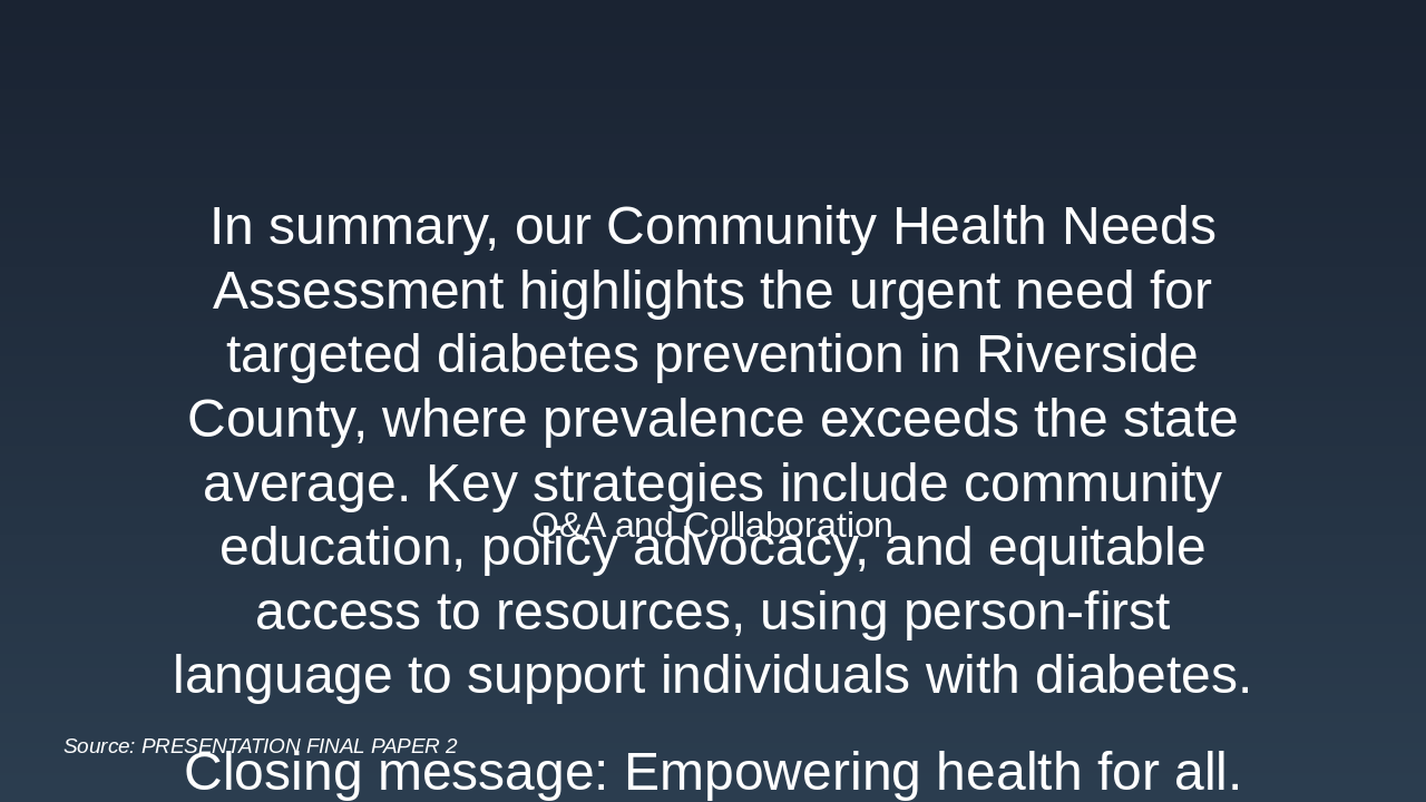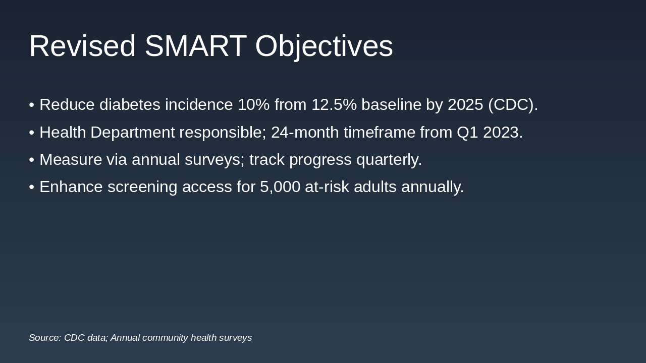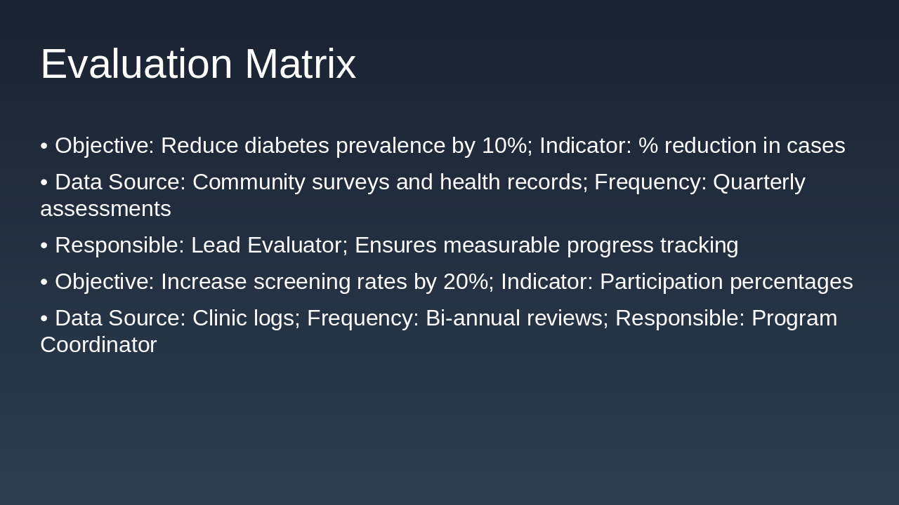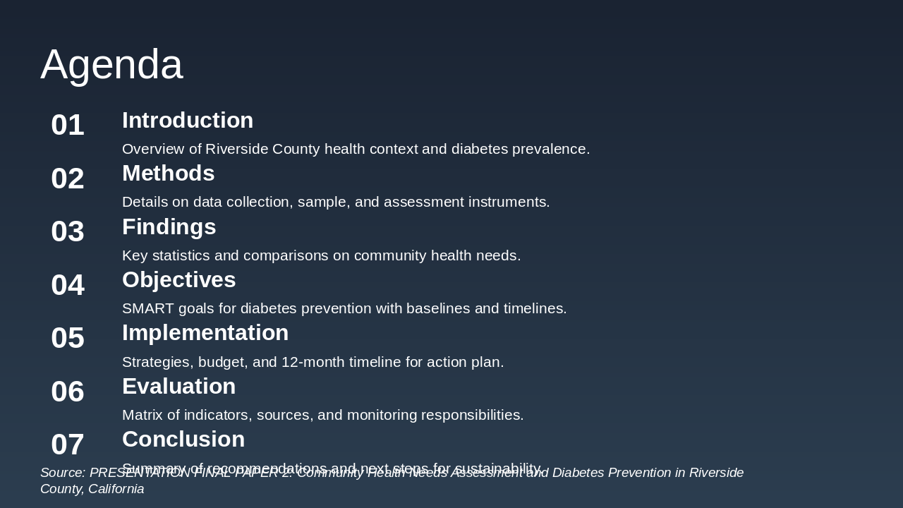 This one-slide overview allocates funds efficiently for the 12-month diabetes prevention program in Riverside County, ensuring comprehensive coverage of inputs, activities, and outcomes. |